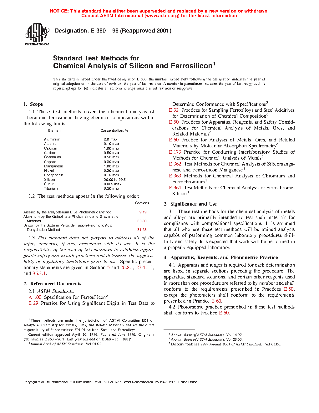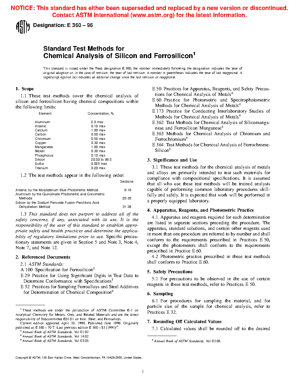 DESIG: E360 96 (Reapproved 2001) ^TITLE: Standard Test Methods for Chemical Analysis of Silicon and Ferrosilicon ^SCOPE: