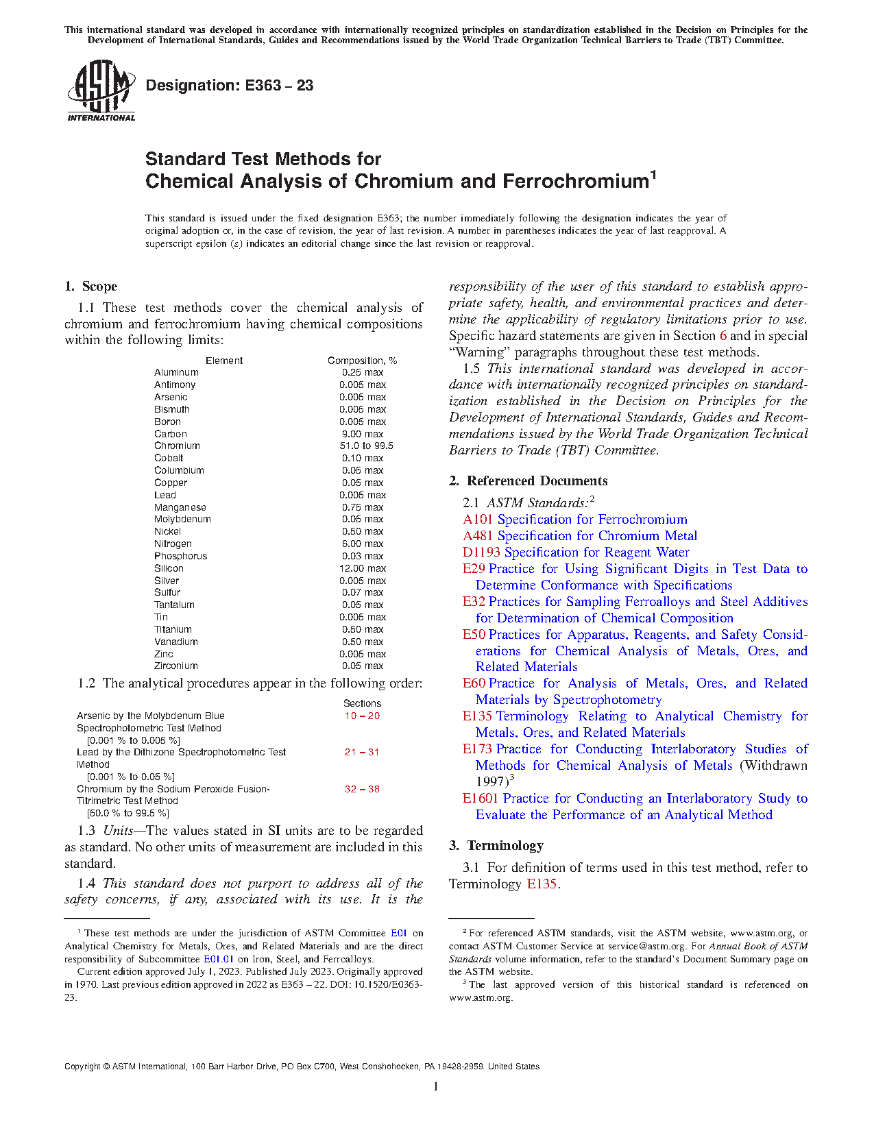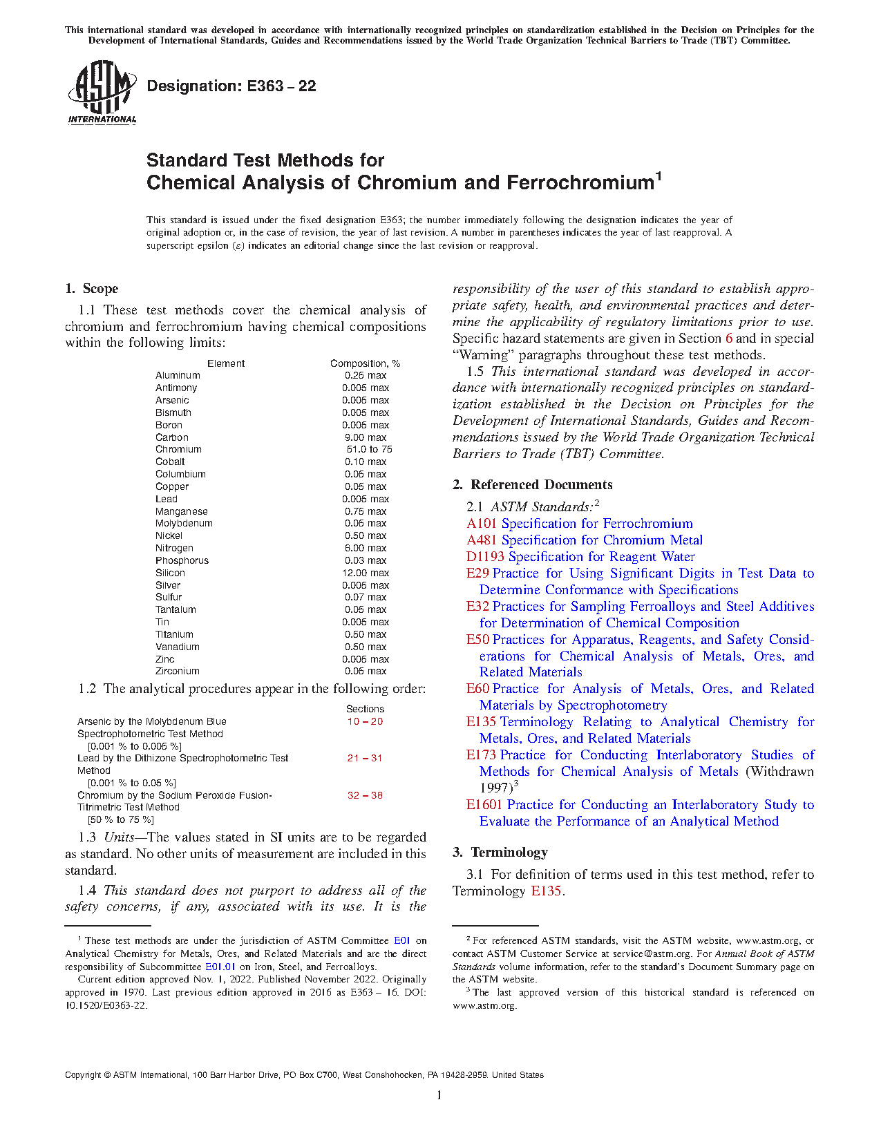1.4 This standard does not purport to address all of the safety concerns, if any, associated with its use. It is the responsibility of whoever uses this standard to consult and establish appropriate safety and health practices and determine the applicability of regulatory limitations prior to use. Specific hazard statements are given in Section 6. 10.1 This test method covers the determination of arsenic in chromium and ferrochromium in concentrations from 0.001 % to 0.005 %. 21.1 This test method covers the determination of lead in chromium and ferrochromium in concentrations from 0.001 % to 0.05 %. 32.1 This test method covers the determination of chromium in all carbon grades of ferrochromium in concentrations from 50 % to 75 %.