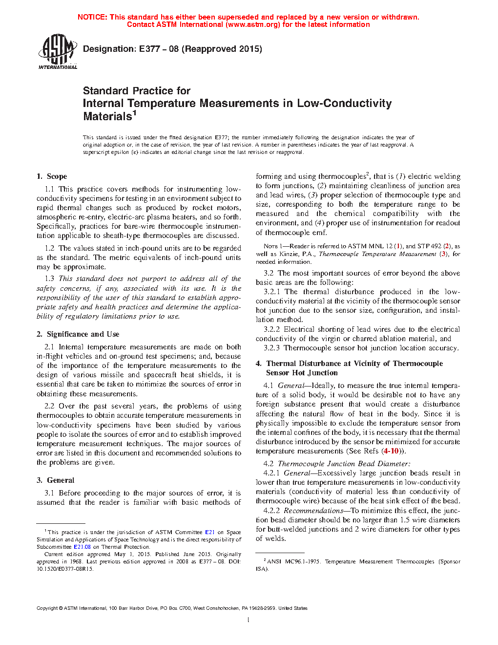2.1 Internal temperature measurements are made on both in-flight vehicles and on-ground test specimens; and, because of the importance of the temperature measurements to the design of various missile and spacecraft heat shields, it is essential that care be taken to minimize the sources of error in obtaining these measurements.