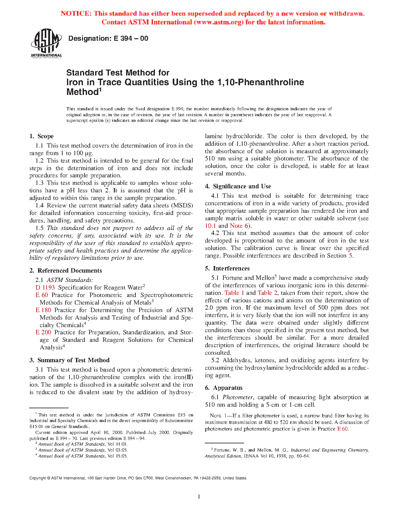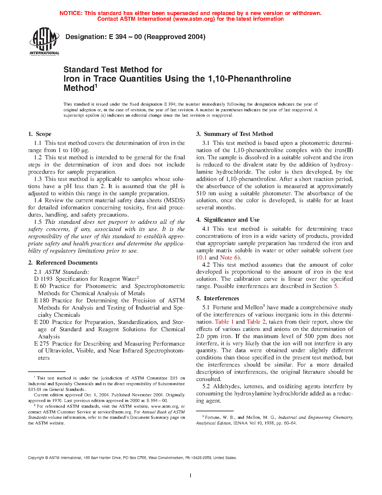 Standard Test Method for Iron in Trace Quantities Using the 1,10-Phenanthroline Method