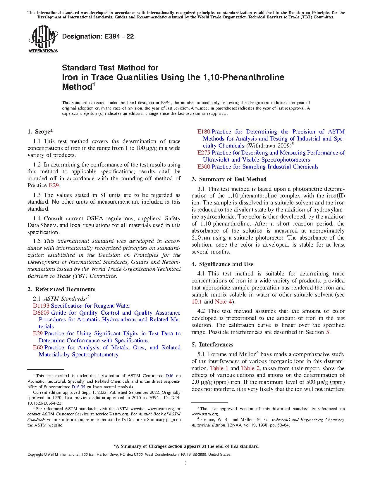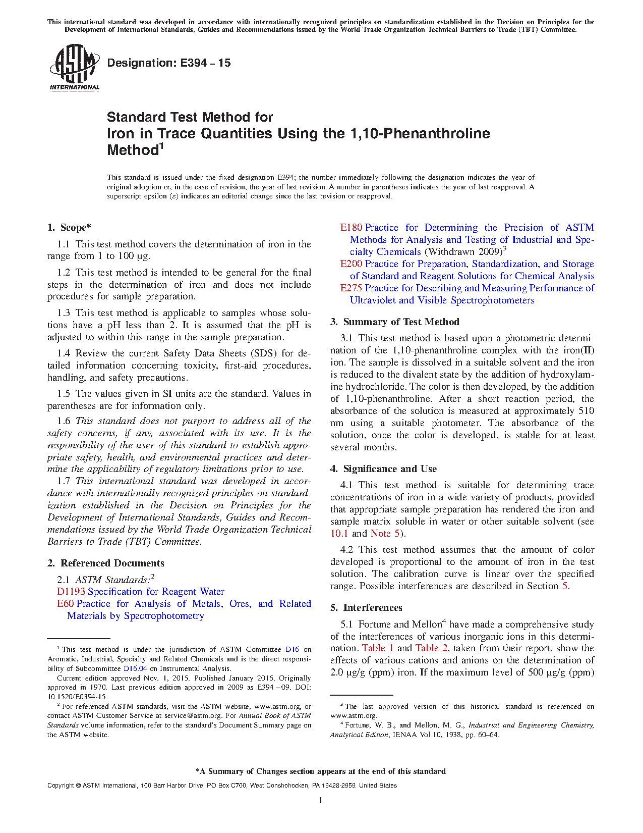 4.2 This test method assumes that the amount of color developed is proportional to the amount of iron in the test solution. The calibration curve is linear over the specified range. Possible interferences are described in Section 5.