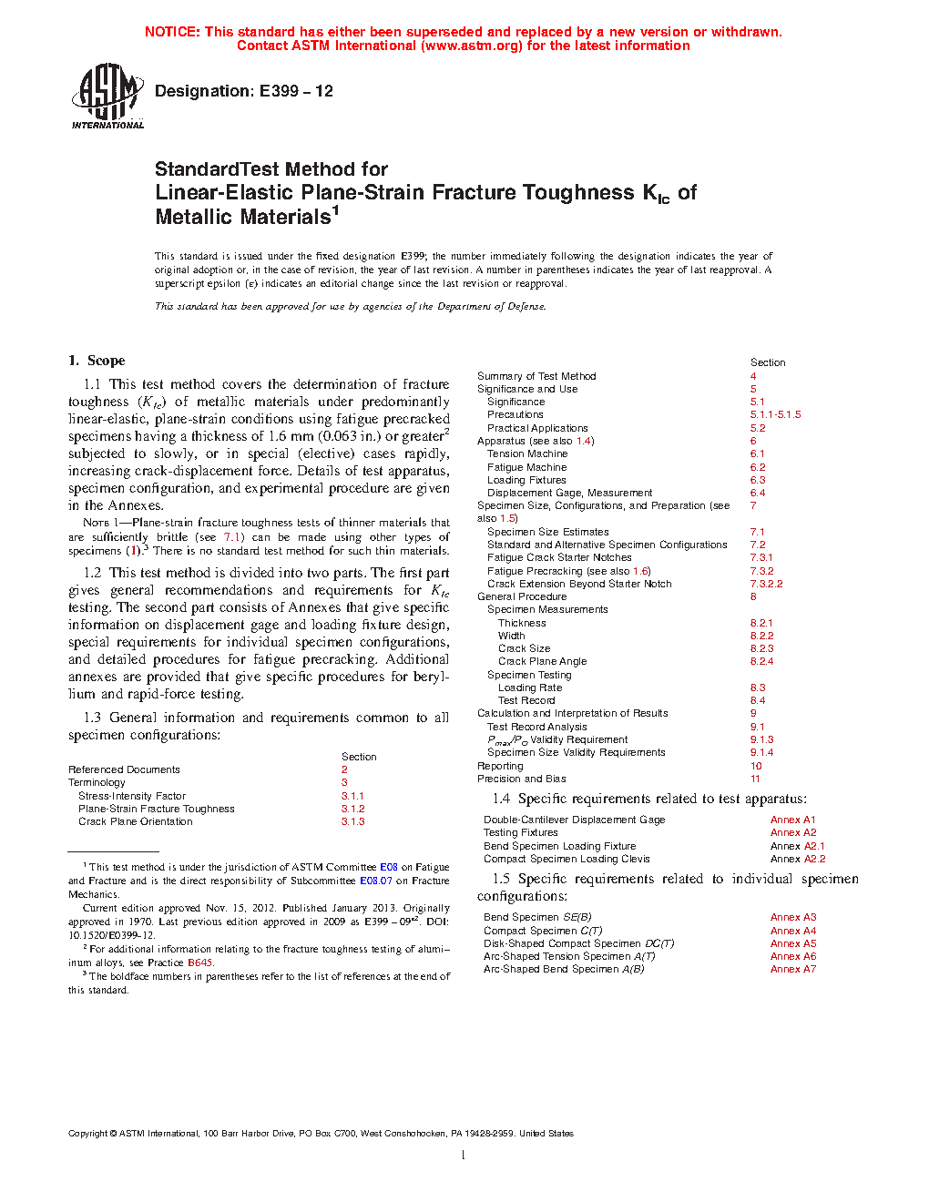 1.2 This test method is divided into two parts. The first part gives general recommendations and requirements for testing and includes specific requirements for the KIc test procedure. The second part consists of Annexes that give specific information on displacement gage and loading fixture design, special requirements for individual specimen configurations, and detailed procedures for fatigue precracking. Additional annexes are provided that give specific procedures for beryllium and rapid-force testing, and the KIsi test procedure, which provides an optional additional analysis procedure for the test data collected as part of the KIc test procedure.