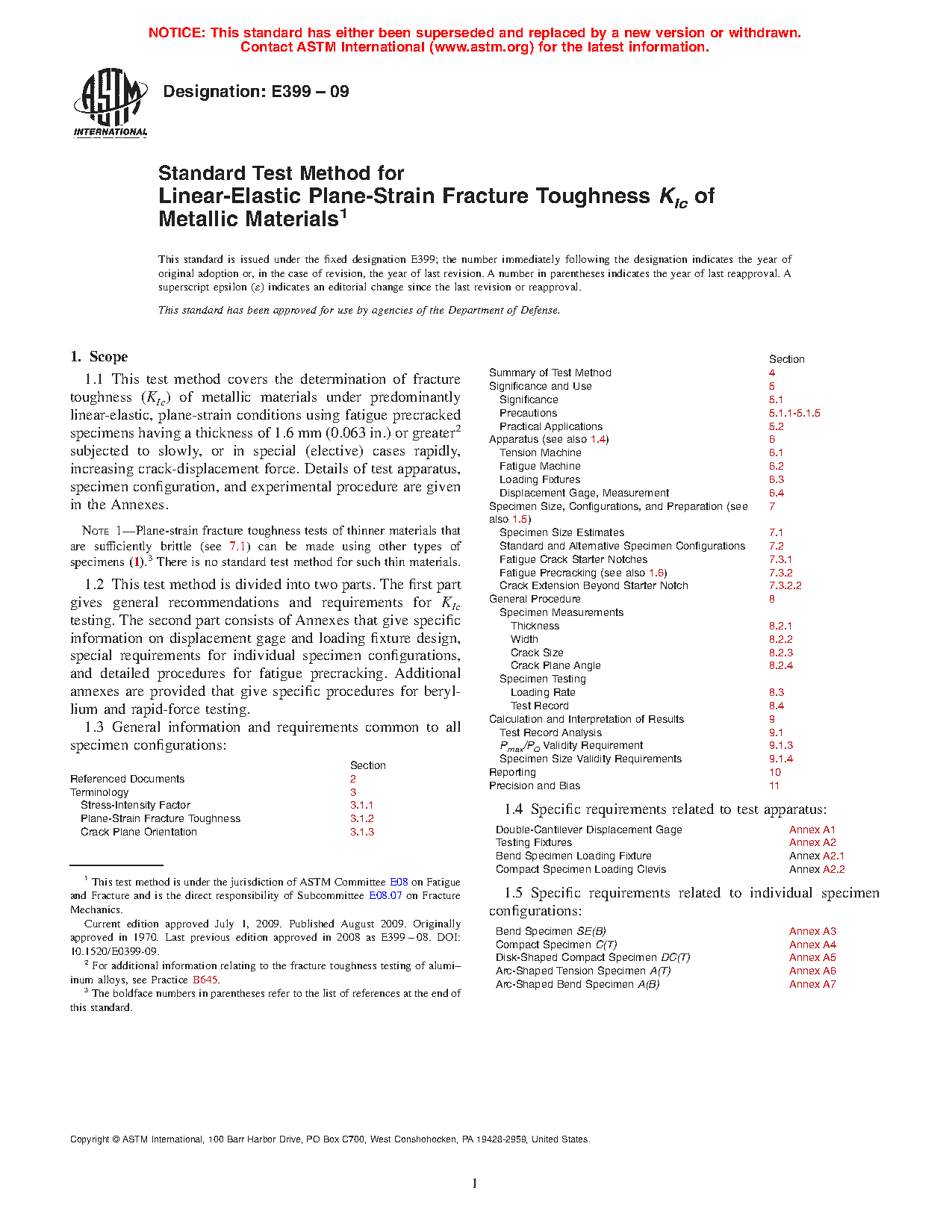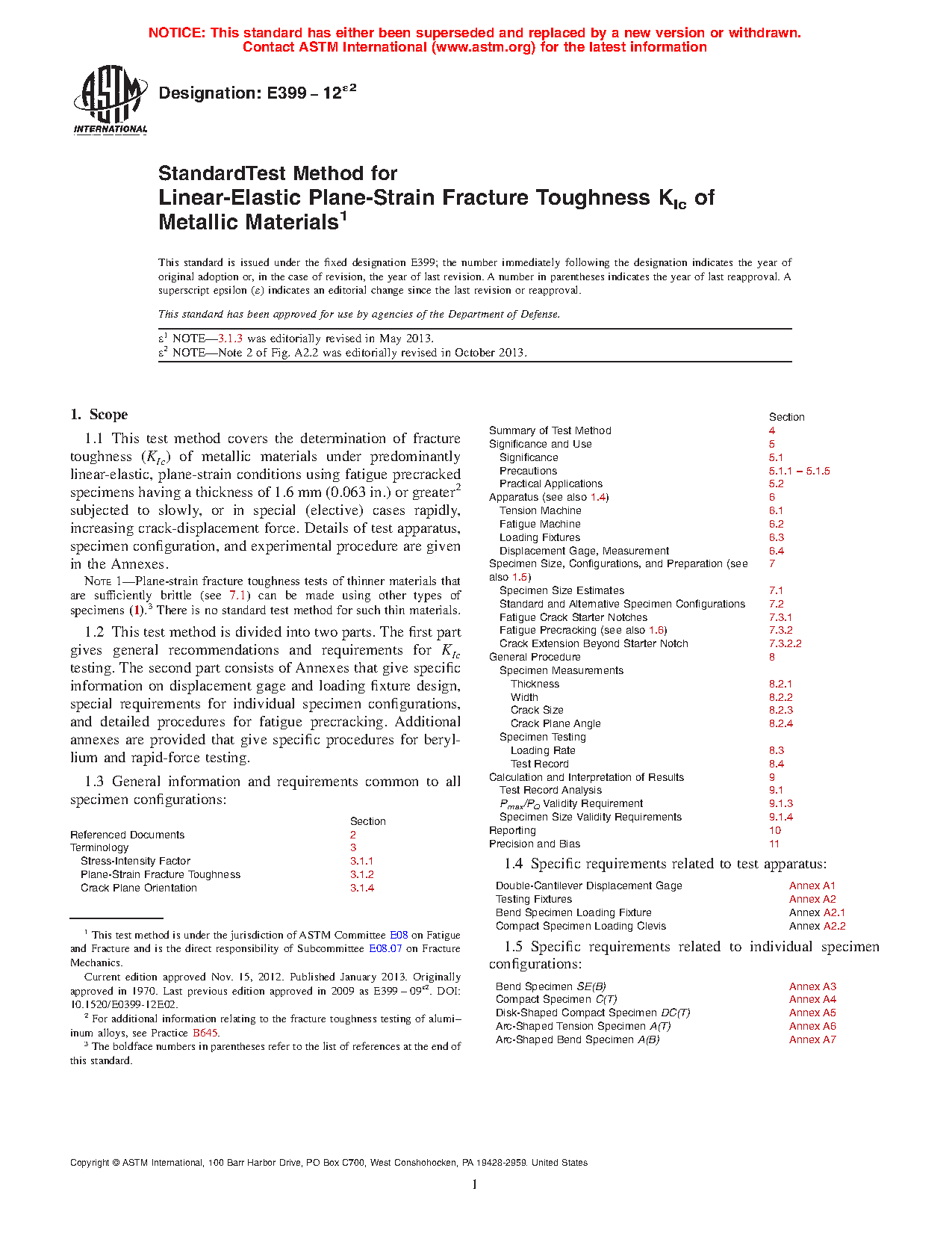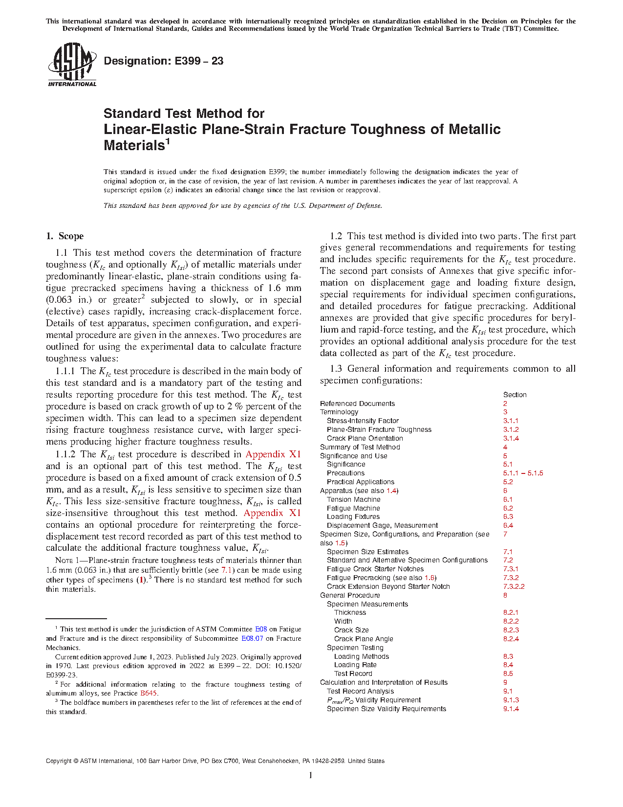 1.1 This test method covers the determination of fracture toughness (KIc and optionally KIsi) of metallic materials under predominantly linear-elastic, plane-strain conditions using fatigue precracked specimens having a thickness of 1.6 mm (0.063 in.) or greater2 subjected to slowly, or in special (elective) cases rapidly, increasing crack-displacement force. Details of test apparatus, specimen configuration, and experimental procedure are given in the annexes. Two procedures are outlined for using the experimental data to calculate fracture toughness values: