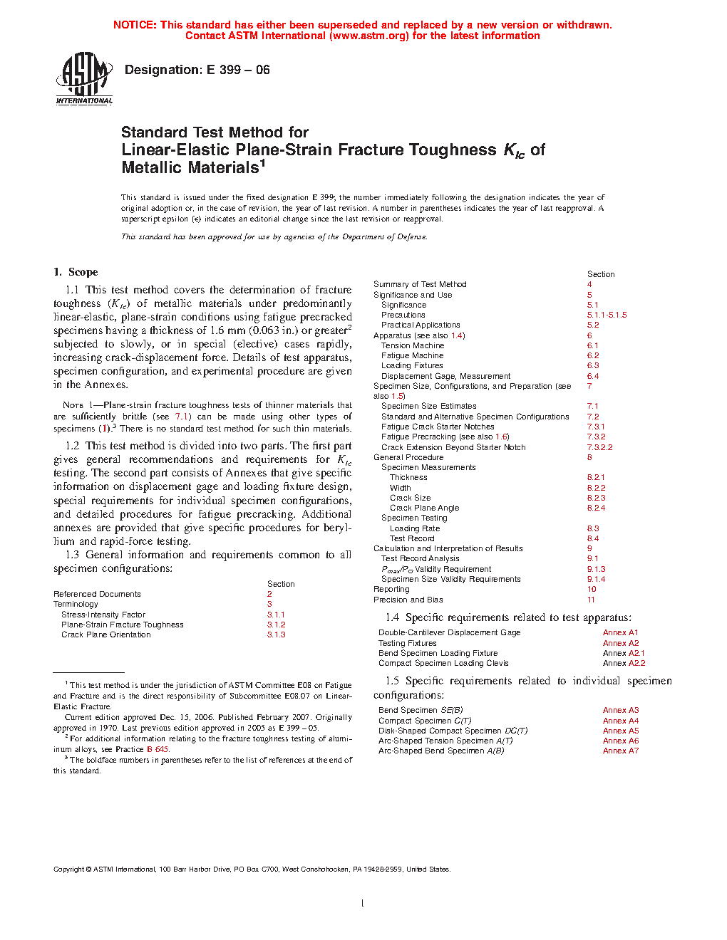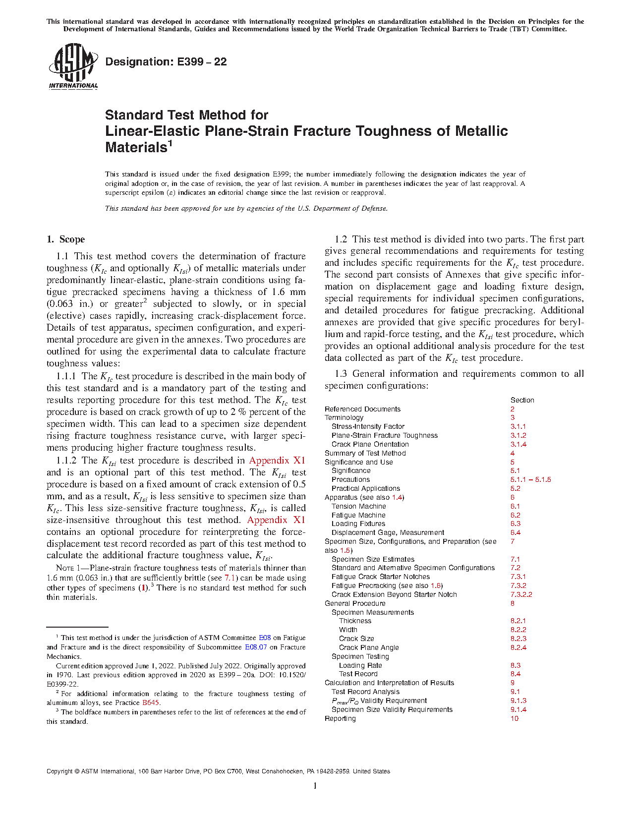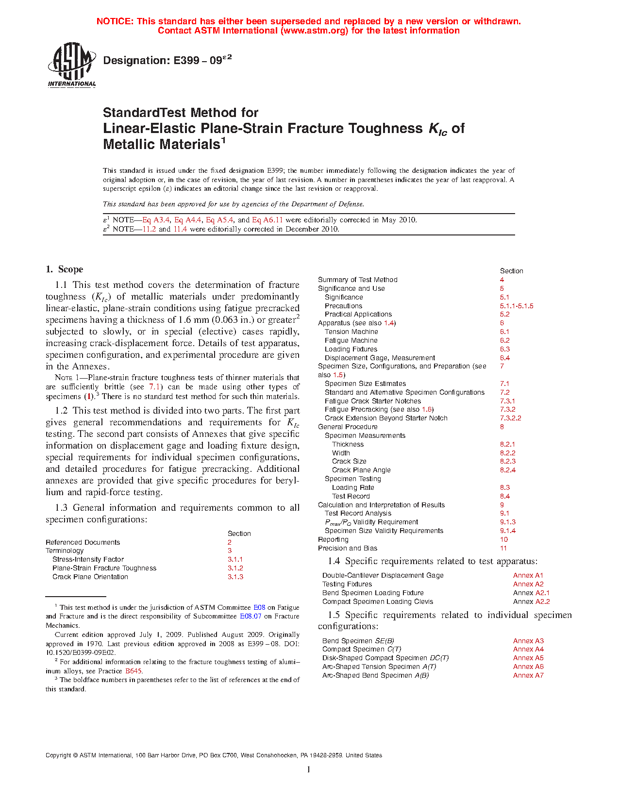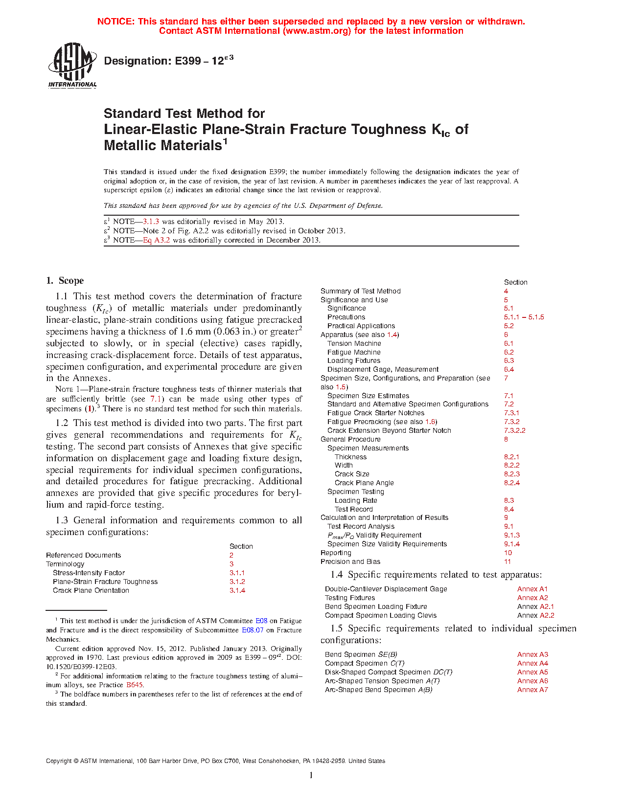 1.1 This test method covers the determination of fracture toughness (KIc and optionally KIsi) of metallic materials under predominantly linear-elastic, plane-strain conditions using fatigue precracked specimens having a thickness of 1.6 mm (0.063 in.) or greater2 subjected to slowly, or in special (elective) cases rapidly, increasing crack-displacement force. Details of test apparatus, specimen configuration, and experimental procedure are given in the annexes. Two procedures are outlined for using the experimental data to calculate fracture toughness values: