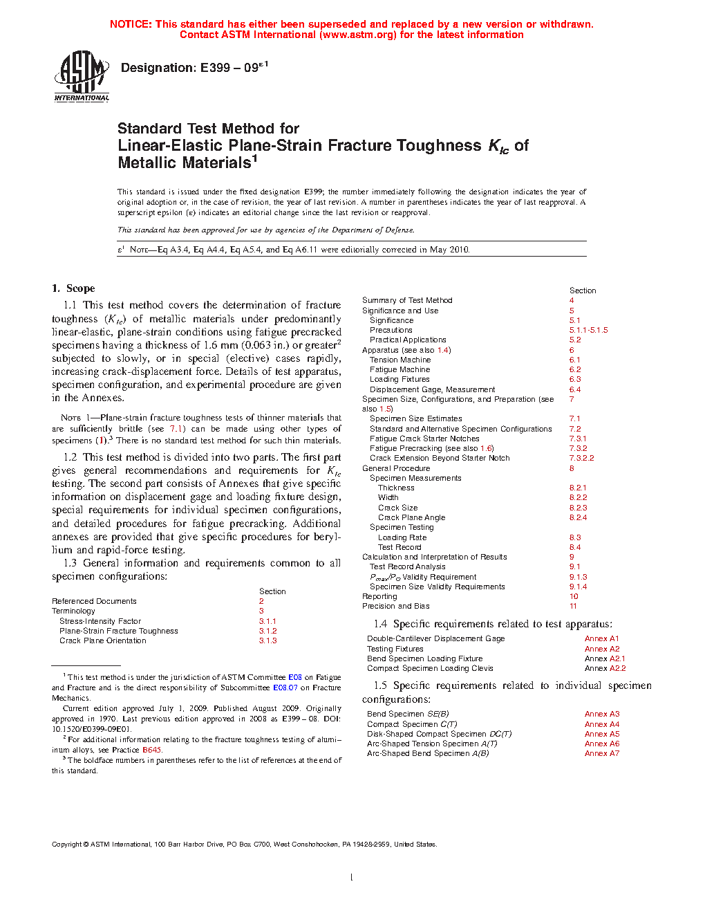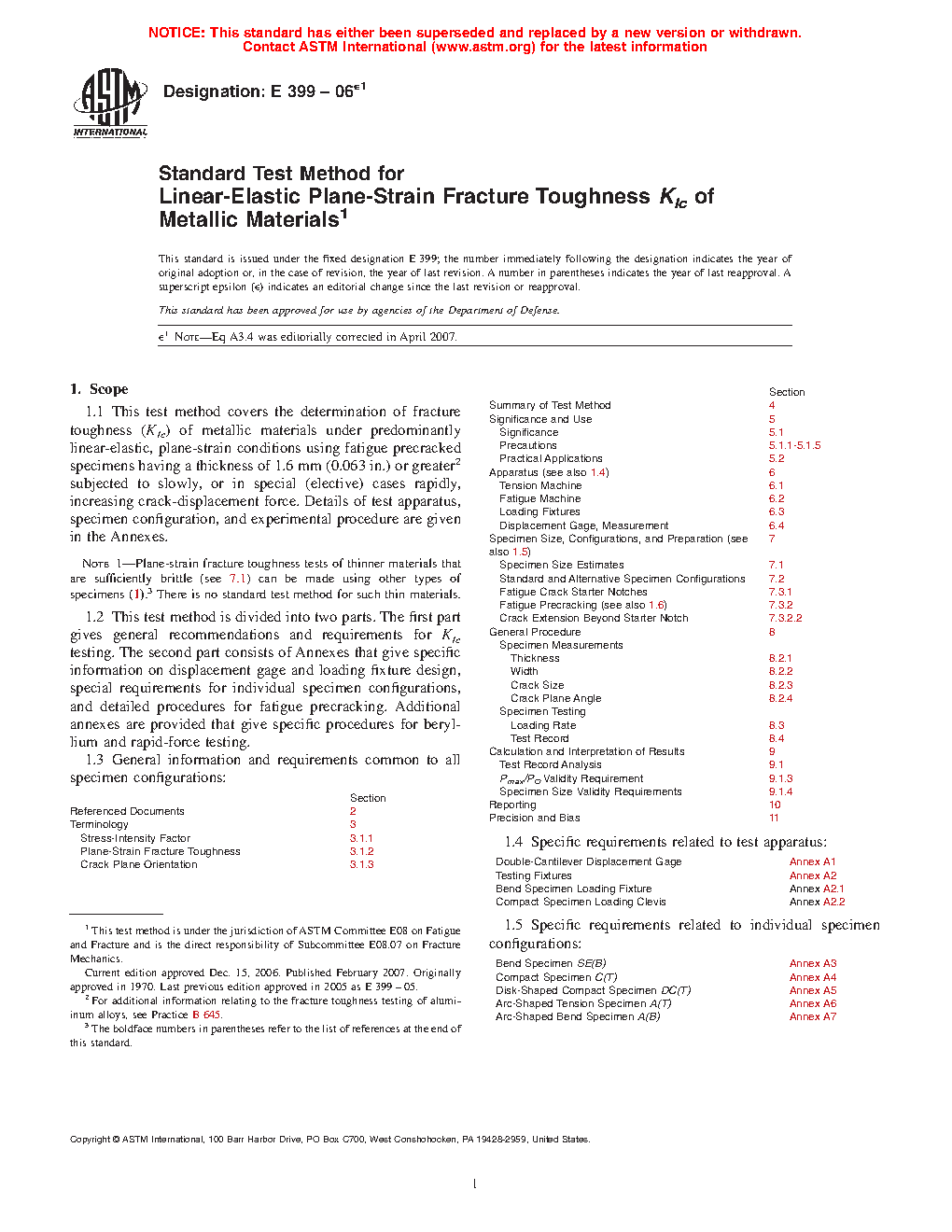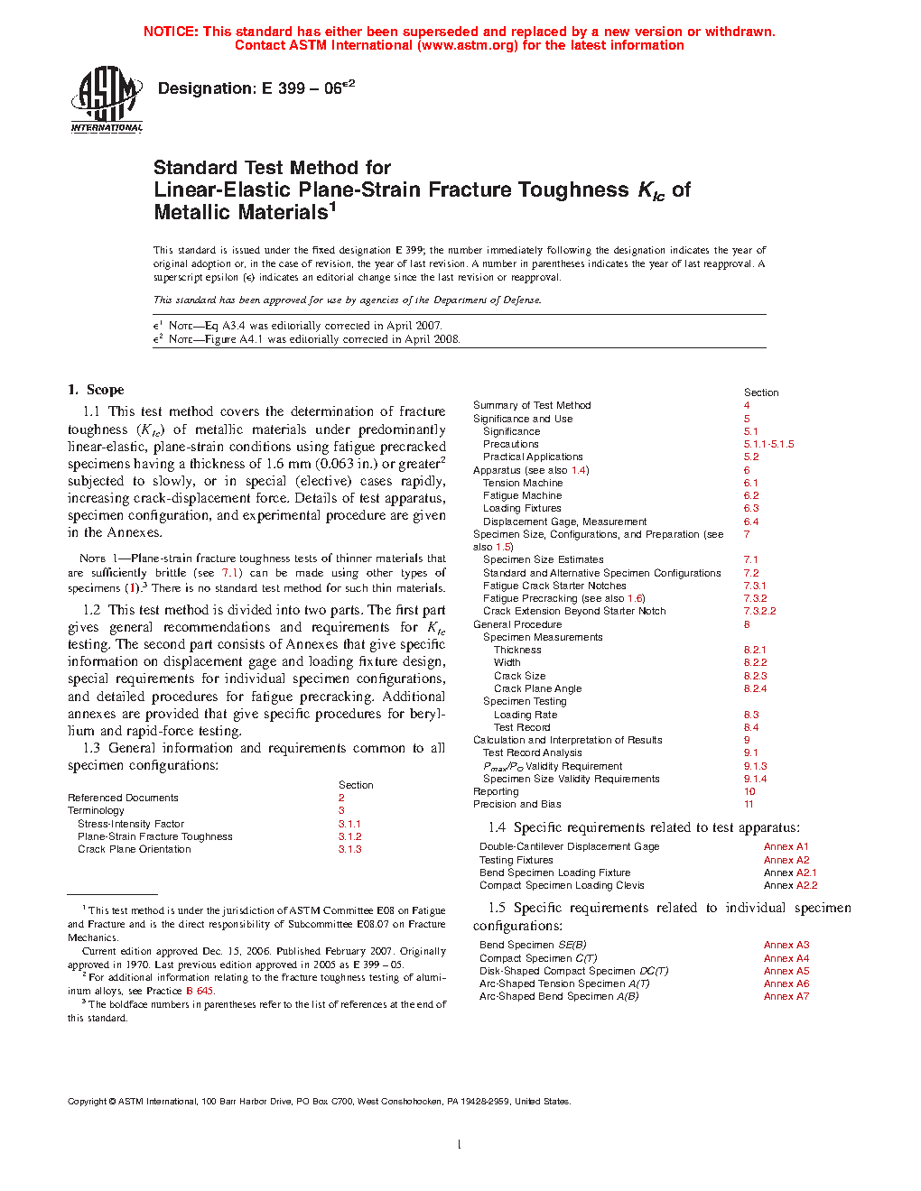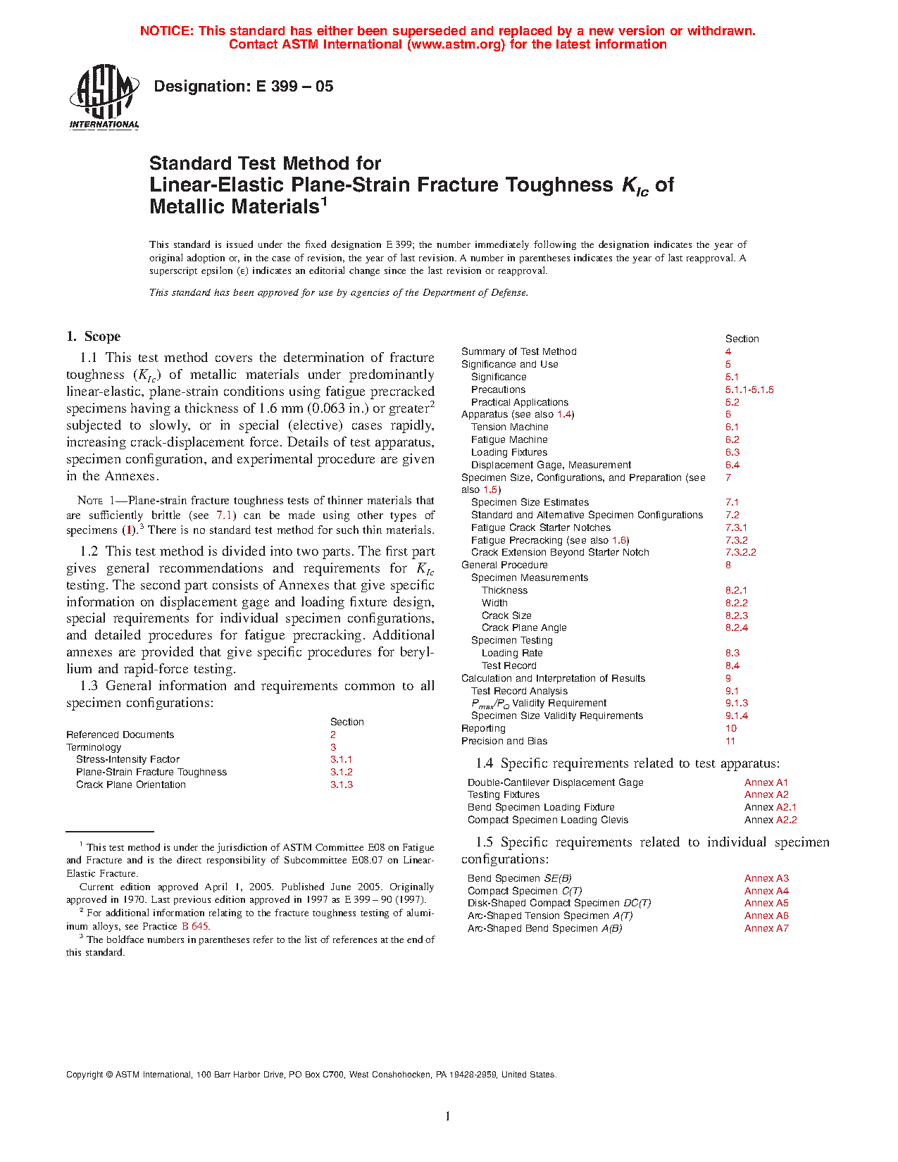 1.1 This test method covers the determination of fracture toughness (KIc and optionally KIsi) of metallic materials under predominantly linear-elastic, plane-strain conditions using fatigue precracked specimens having a thickness of 1.6 mm (0.063 in.) or greater2 subjected to slowly, or in special (elective) cases rapidly, increasing crack-displacement force. Details of test apparatus, specimen configuration, and experimental procedure are given in the annexes. Two procedures are outlined for using the experimental data to calculate fracture toughness values: