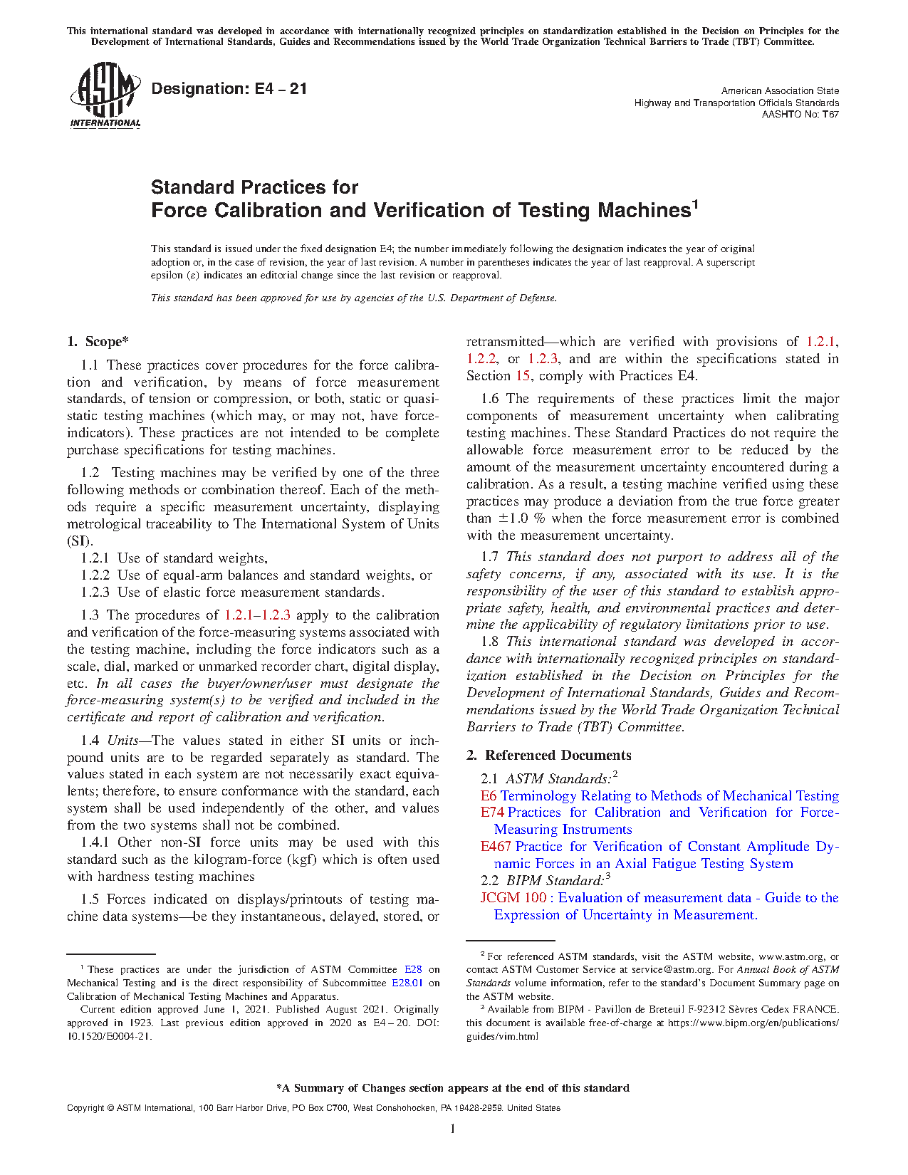 Testing machines that apply and indicate force are used in many industries, in many ways. They may be used in a research laboratory to measure material properties, and in a production line to qualify a product for shipment. No matter what the end use of the machine may be, it is necessary for users to know the amount of force that is applied and indicated, and that the accuracy of the force is traceable to the National Institute of Standards and Technology (NIST), formerly NBS. Practices E 4 provides a procedure to verify these machines, in order that the indicated forces may be traceable. A key element to this NIST traceability is that the devices used in the verification have known force characteristics, and have been calibrated in accordance with Practice E 74