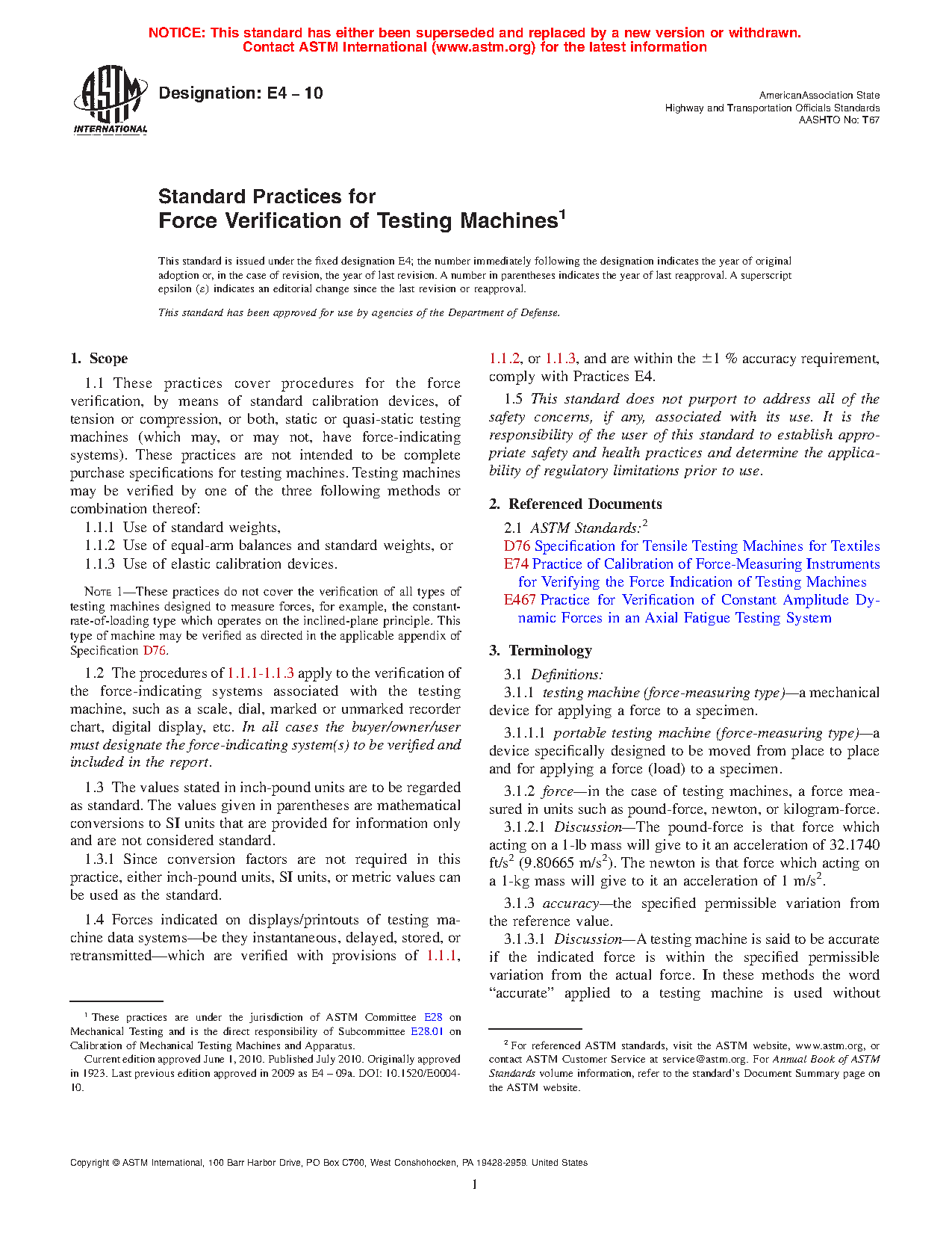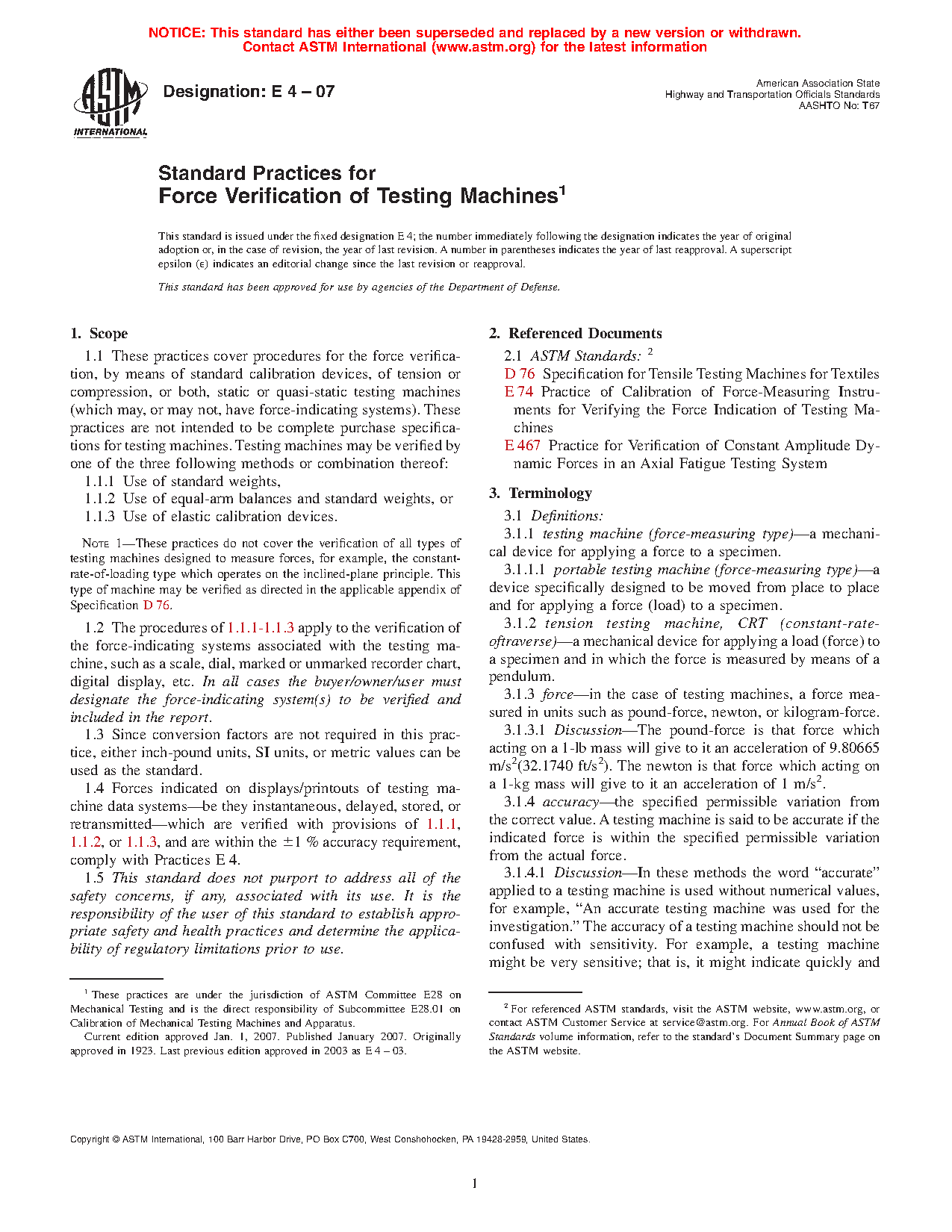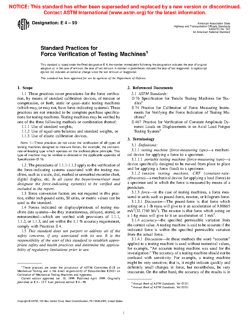 1.1 These practices cover procedures for the force verification, by means of standard calibration devices, of tension or compression, or both, static or quasi-static testing machines (which may, or may not, have force-indicating systems). These practices are not intended to be complete purchase specifications for testing machines. Testing machines may be verified by one of the three following methods or combination thereof: