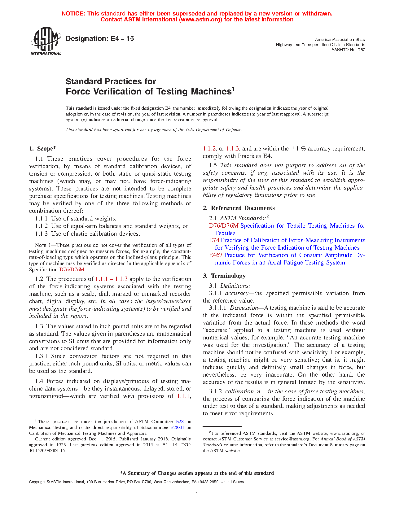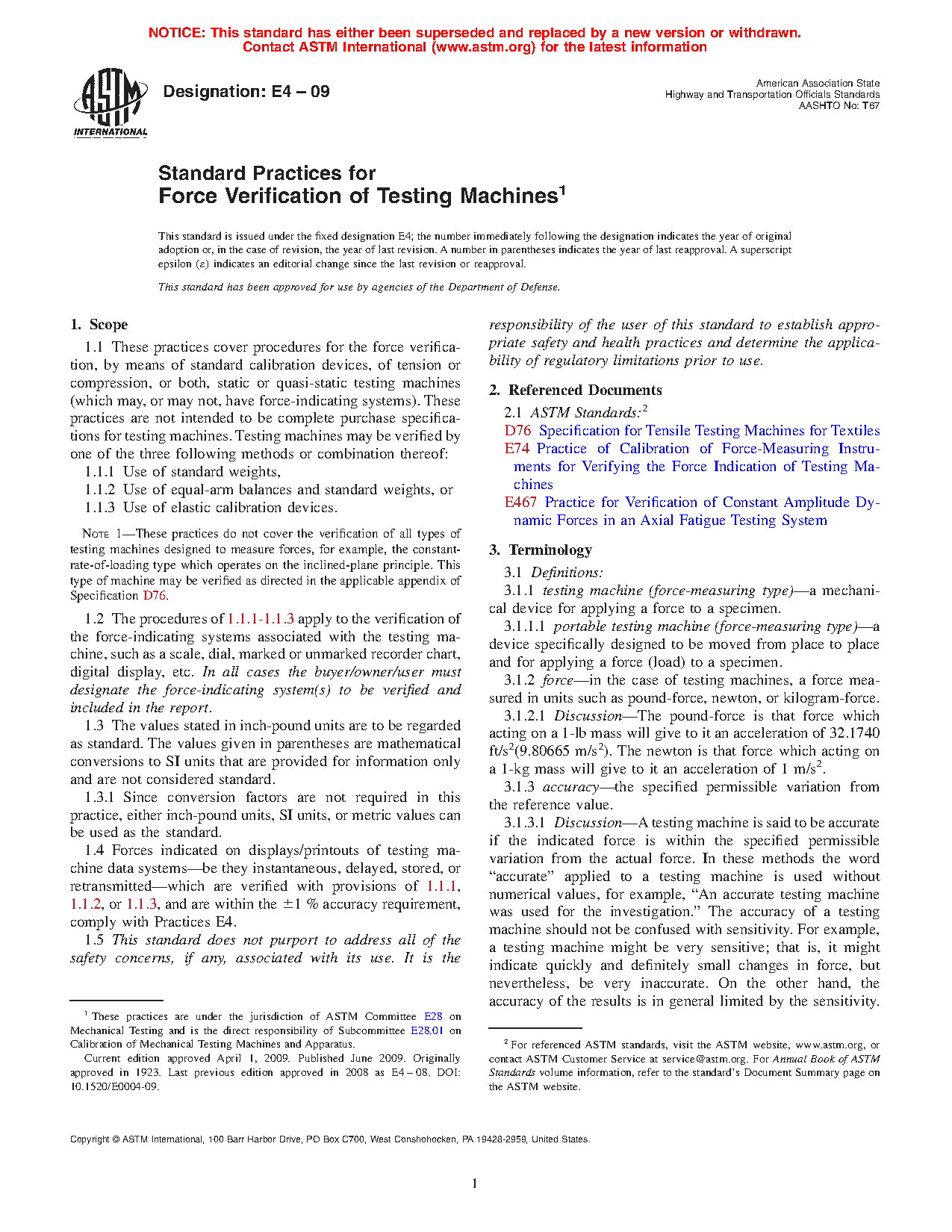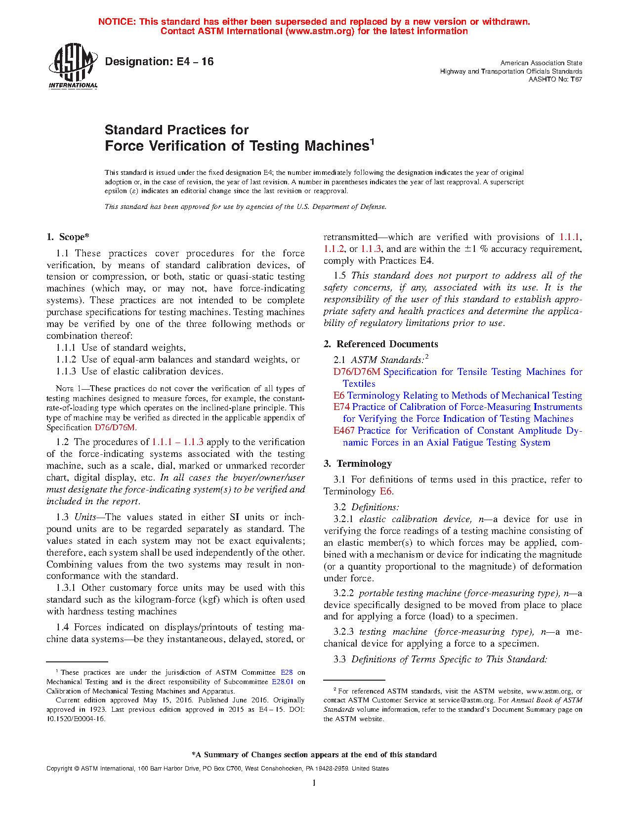 1.1 These practices cover procedures for the force verification, by means of standard calibration devices, of tension or compression, or both, static or quasi-static testing machines (which may, or may not, have force-indicating systems). These practices are not intended to be complete purchase specifications for testing machines. Testing machines may be verified by one of the three following methods or combination thereof: