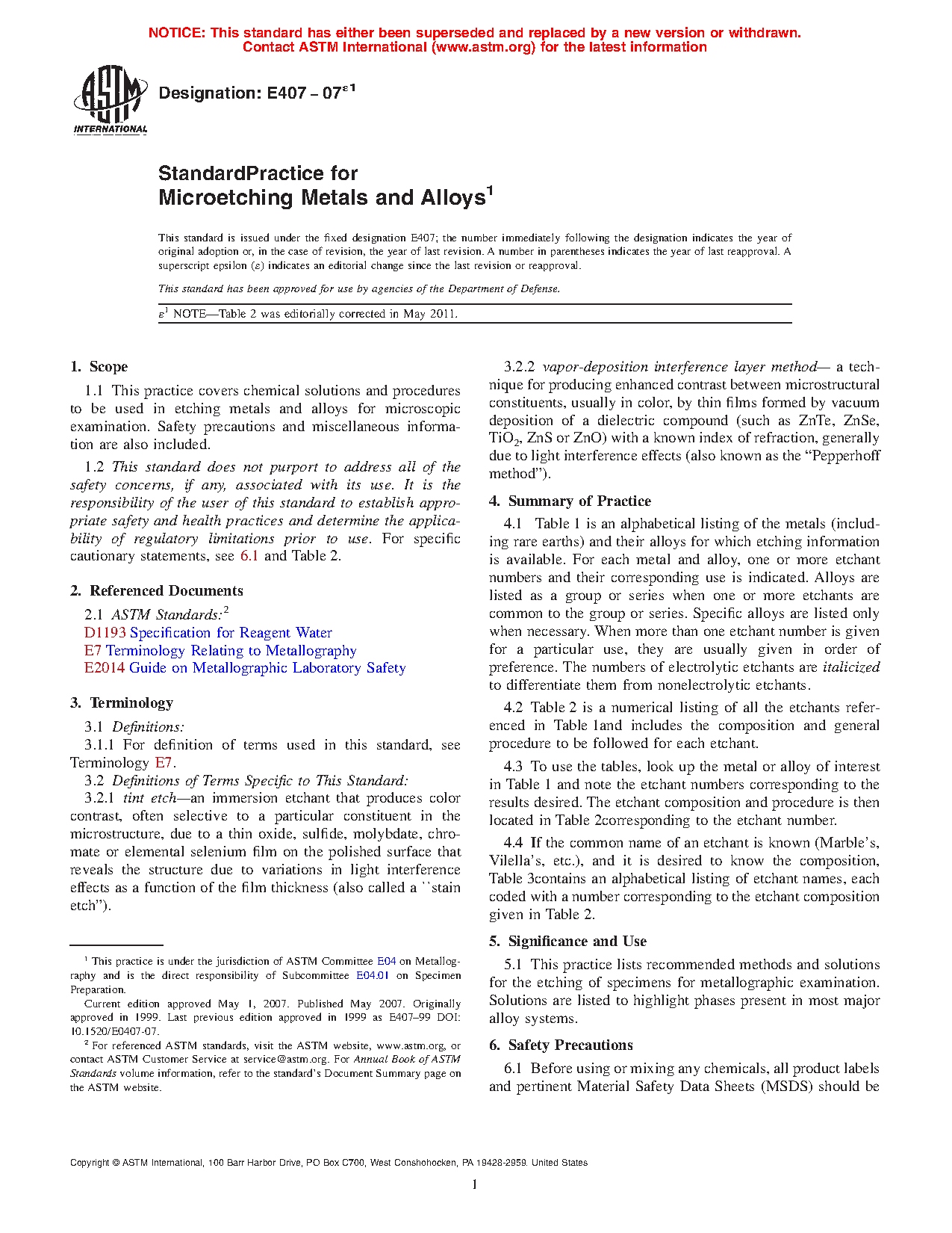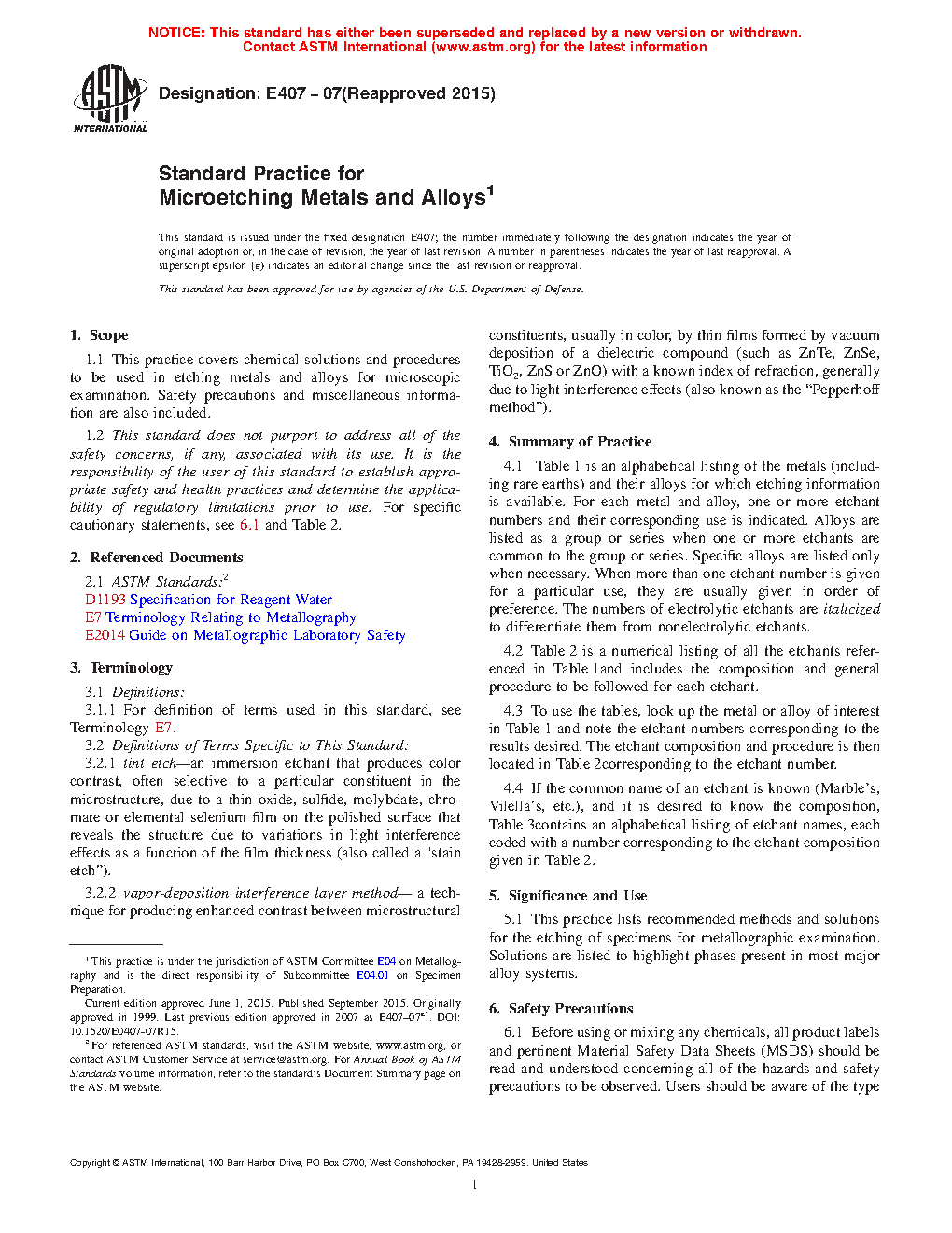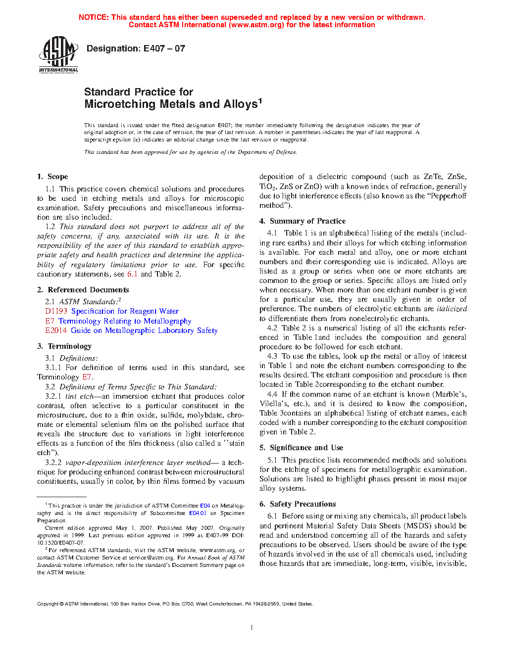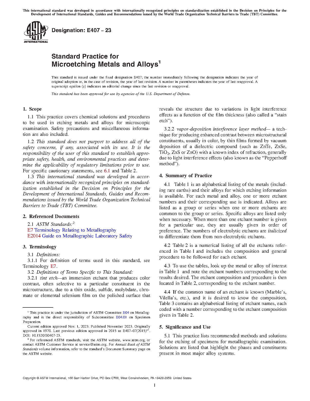 5.1 This practice lists recommended methods and solutions for the etching of specimens for metallographic examination. Solutions are listed to highlight phases present in most major alloy systems.