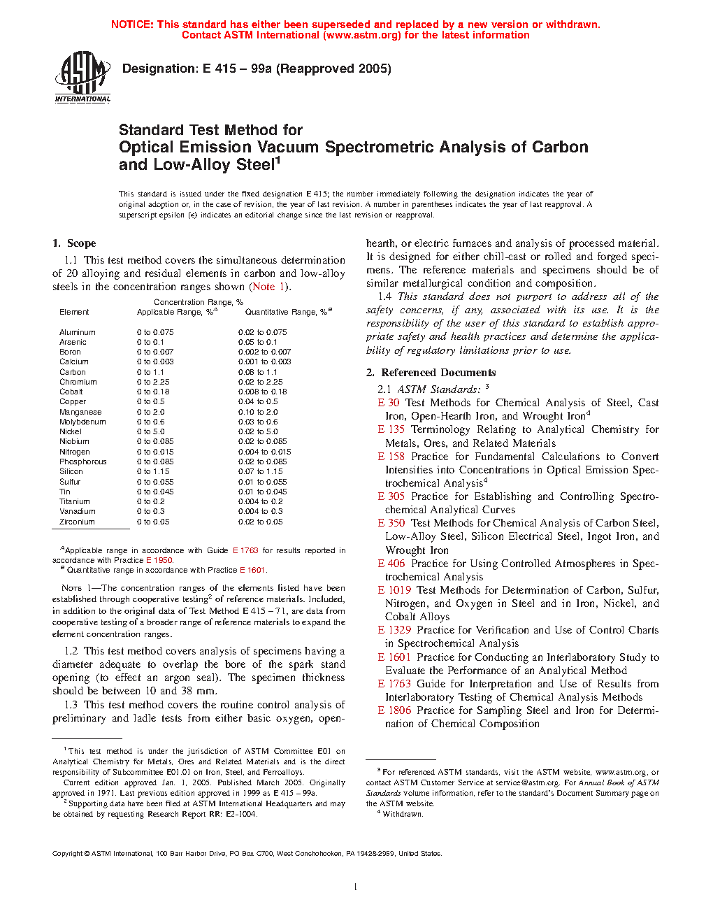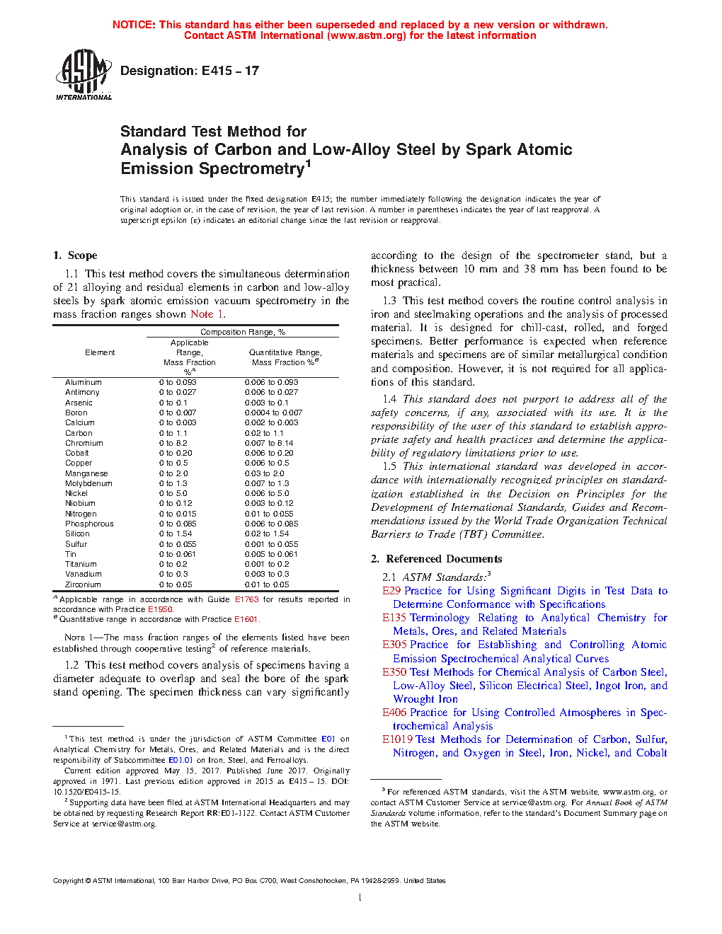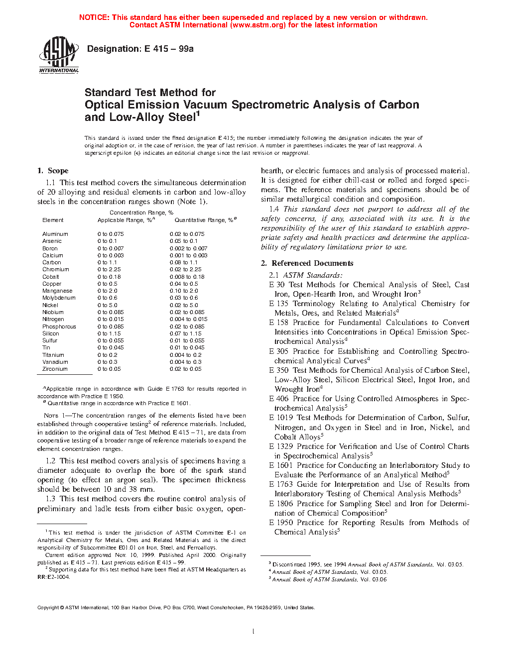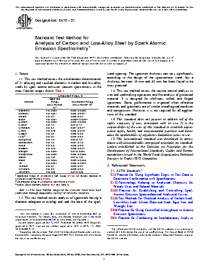 Note 1—The concentration ranges of the elements listed have been established through cooperative testing of reference materials. Included, in addition to the original data of Test Method E 415 – 71, are data from cooperative testing of a broader range of reference materials to expand the element concentration ranges.