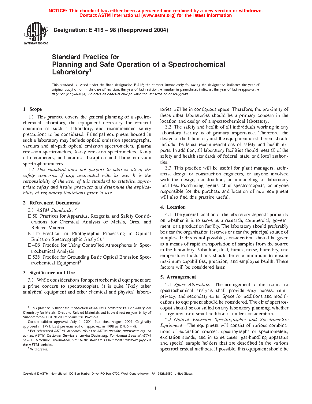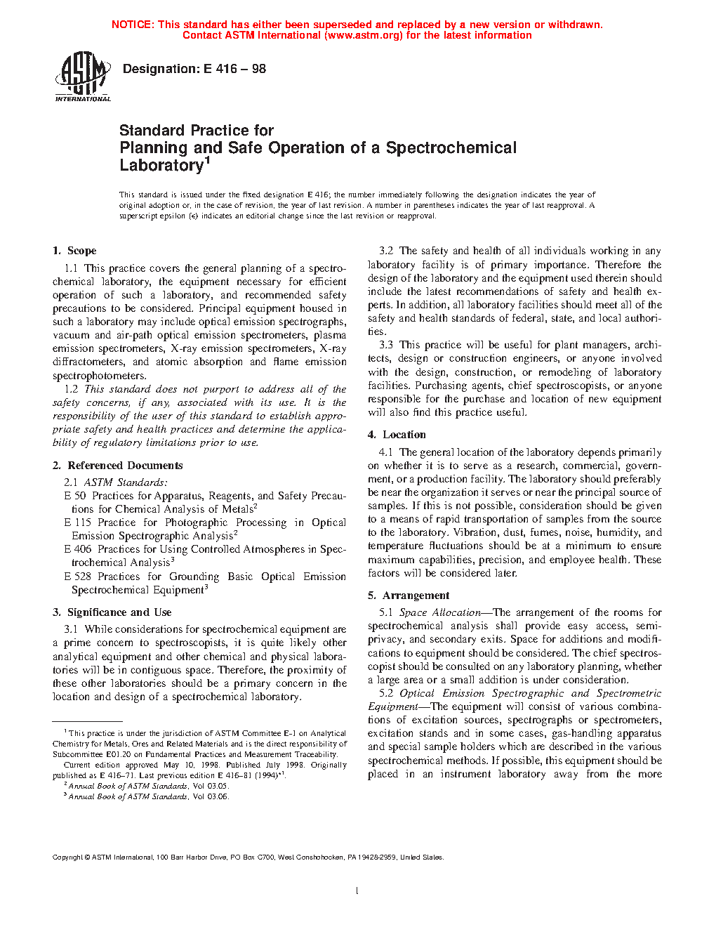 1.1 This practice covers the general planning of a spectrochemical laboratory, the equipment necessary for efficient operation of such a laboratory, and recommended safety precautions to be considered. Principal equipment housed in such a laboratory may include optical emission spectrographs, vacuum and air-path optical emission spectrometers, plasma emission spectrometers, X-ray emission spectrometers, X-ray diffractometers, and atomic absorption and flame emission spectrophotometers.