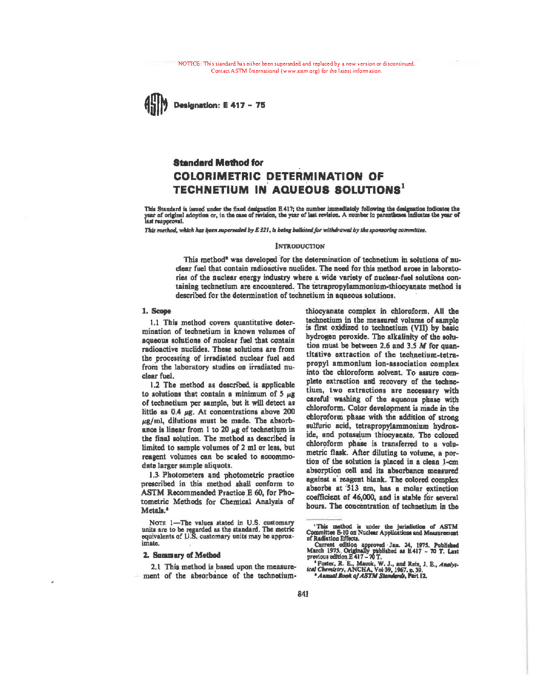 Method for Colorimetric Determination of Technetium in Aqueous Solutions (Withdrawn 1977)
