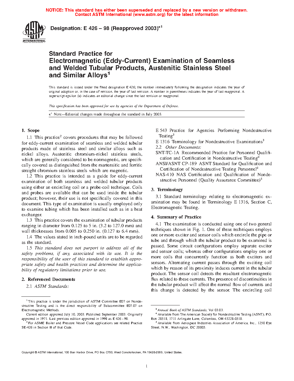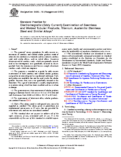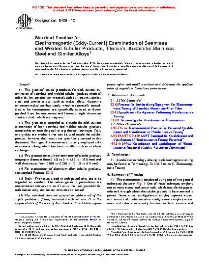 1.1 This practice2 covers procedures for eddy current examination of seamless and welded tubular products made of relatively low conductivity materials such as titanium, stainless steel, and similar alloys, such as nickel alloys. Austenitic chromium-nickel stainless steels, which are generally considered to be nonmagnetic, are specifically covered as distinguished from the martensitic and ferritic straight chromium stainless steels which are magnetic.