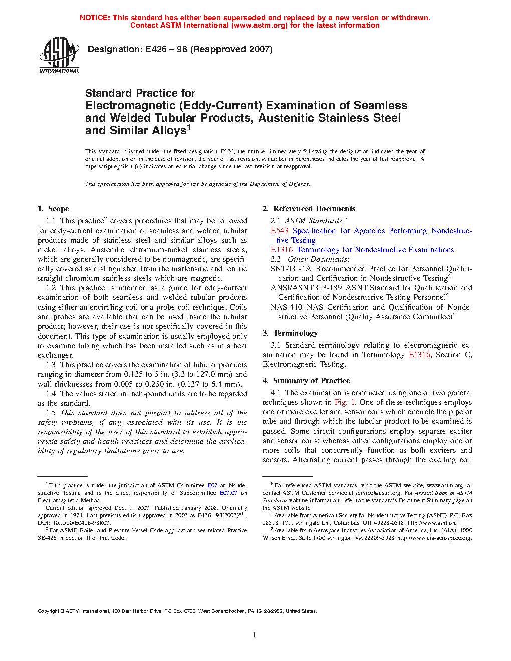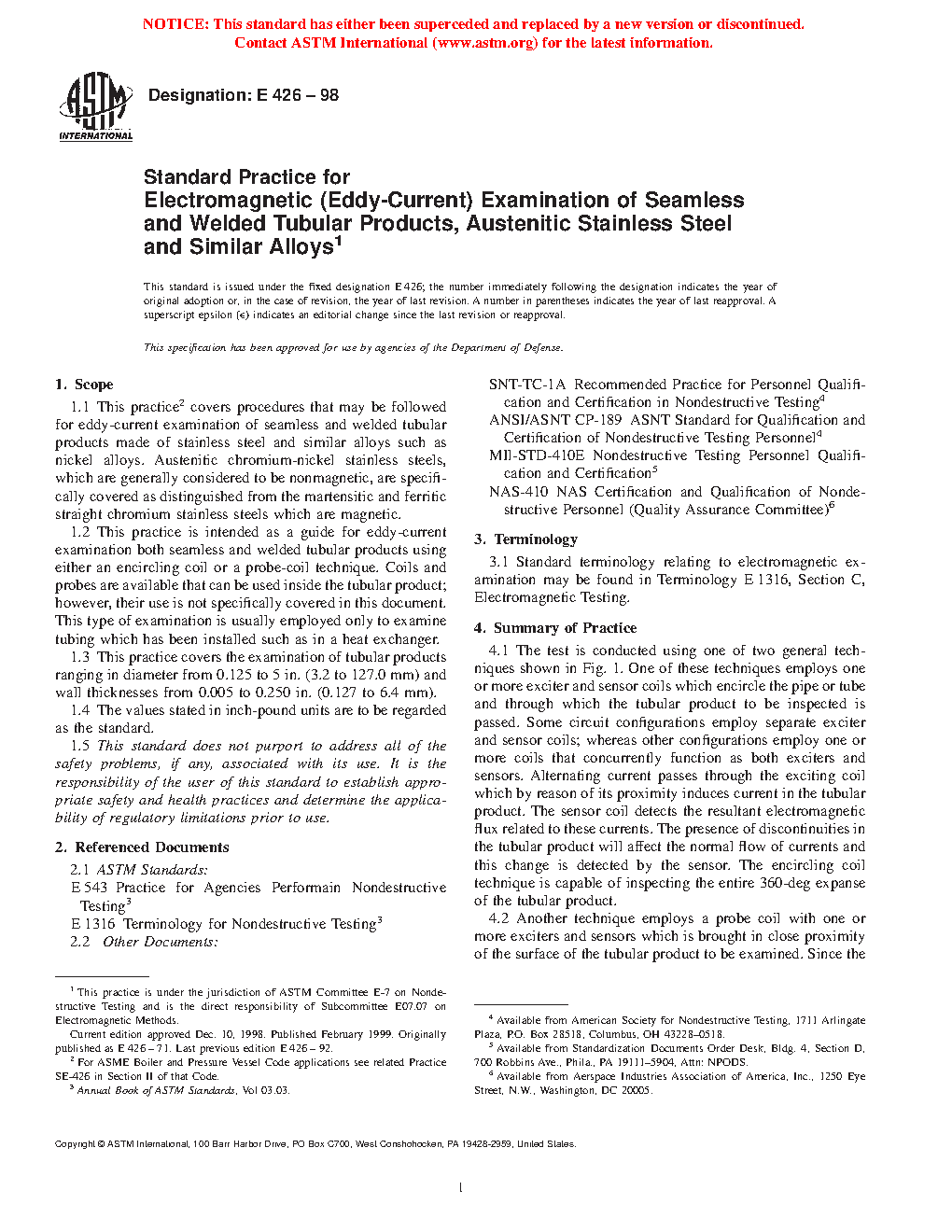 1.2 This practice is intended as a guide for eddy current examination of both seamless and welded tubular products using either an encircling coil or a probe-coil technique. Coils and probes are available that can be used inside the tubular product; however, their use is not specifically covered in this document. This type of examination is usually employed only to examine tubing which has been installed such as in a heat exchanger.