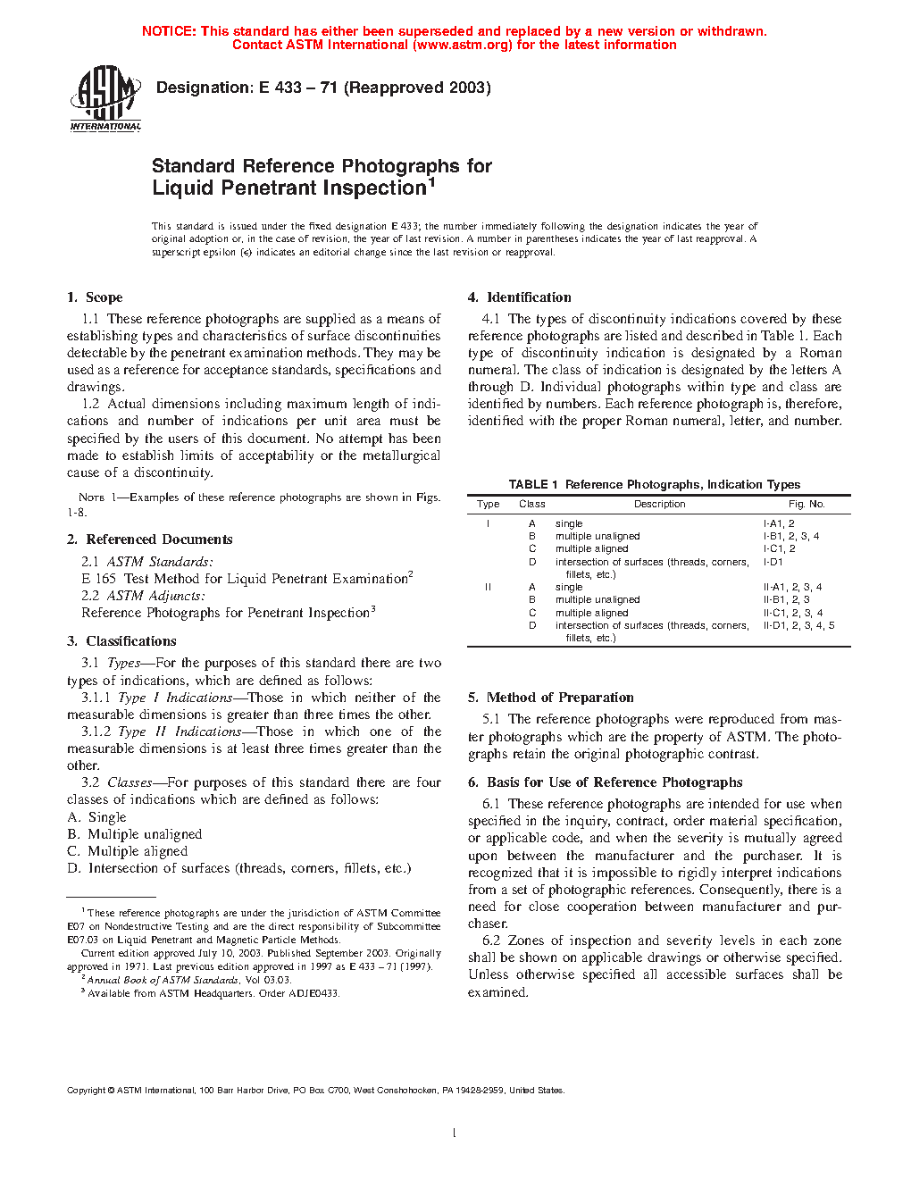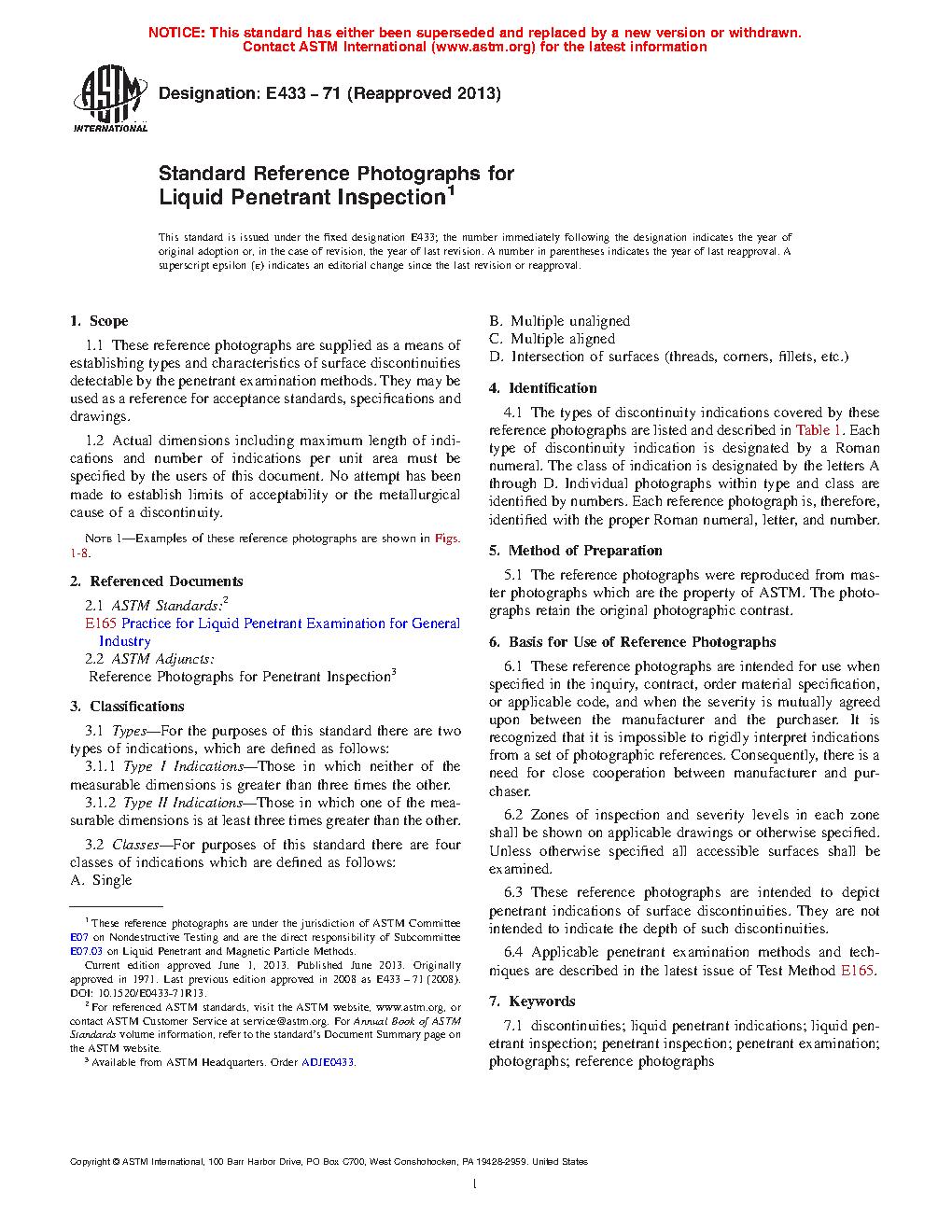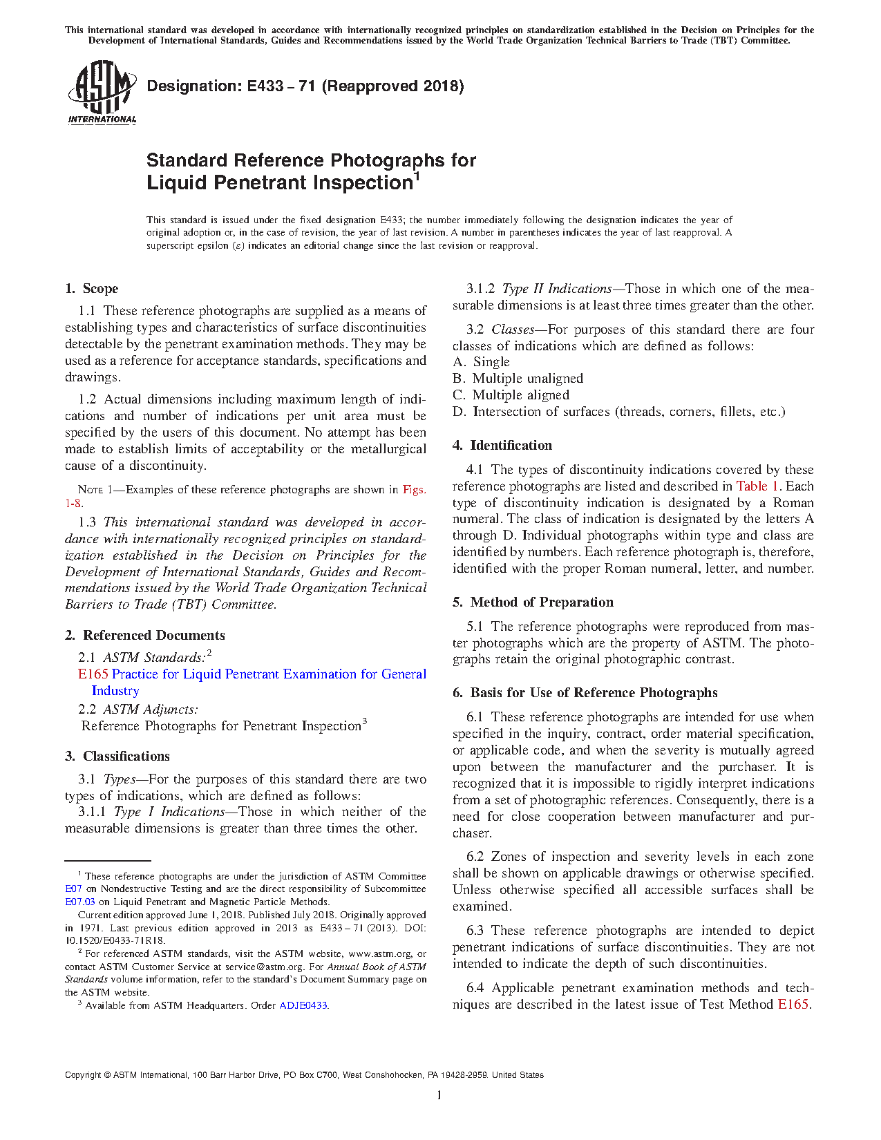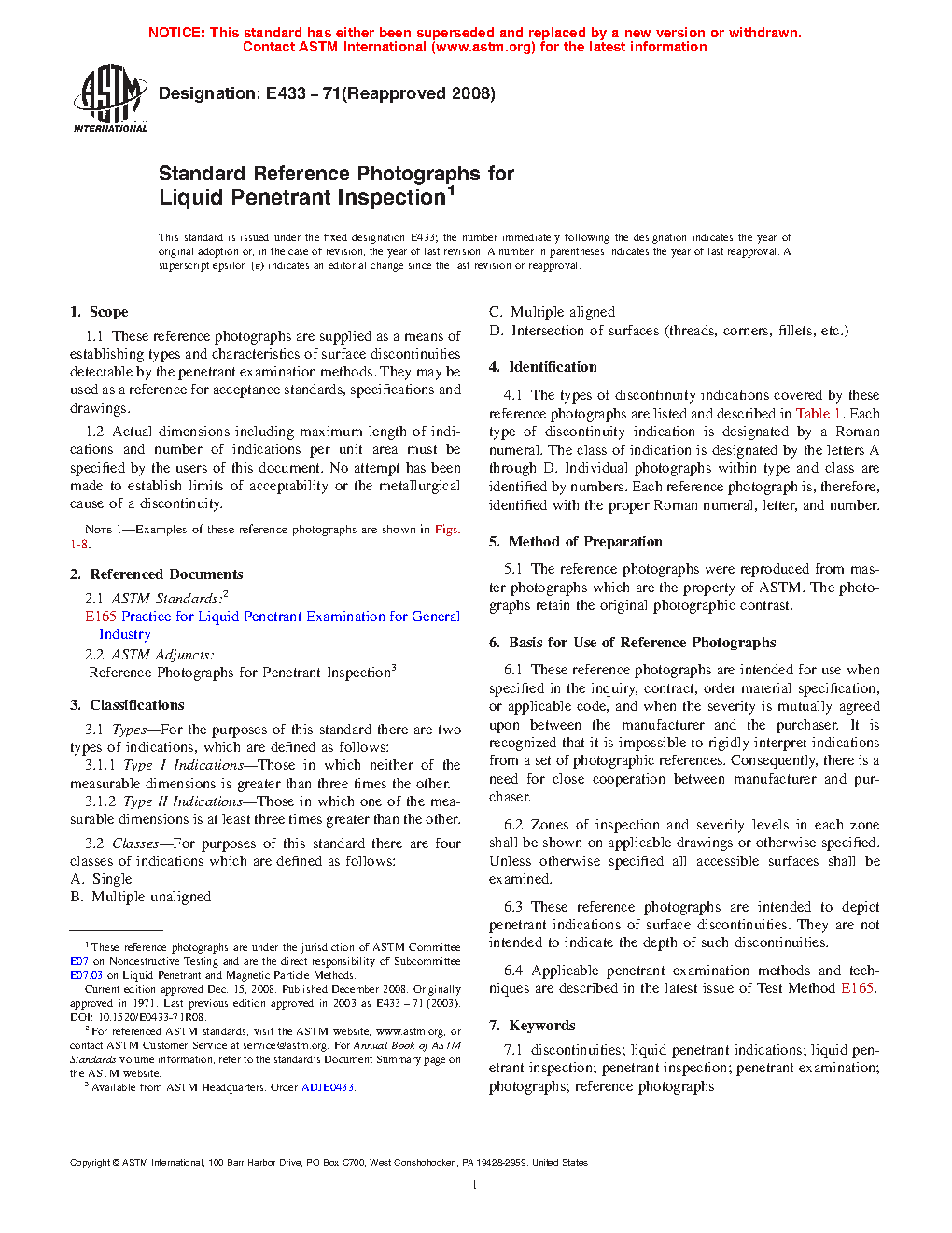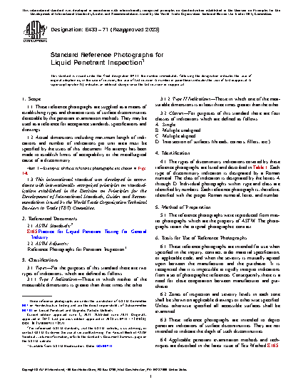 1.1 These reference photographs are supplied as a means of establishing types and characteristics of surface discontinuities detectable by the penetrant inspection methods. They may be used as a reference for acceptance standards, specifications and drawings.