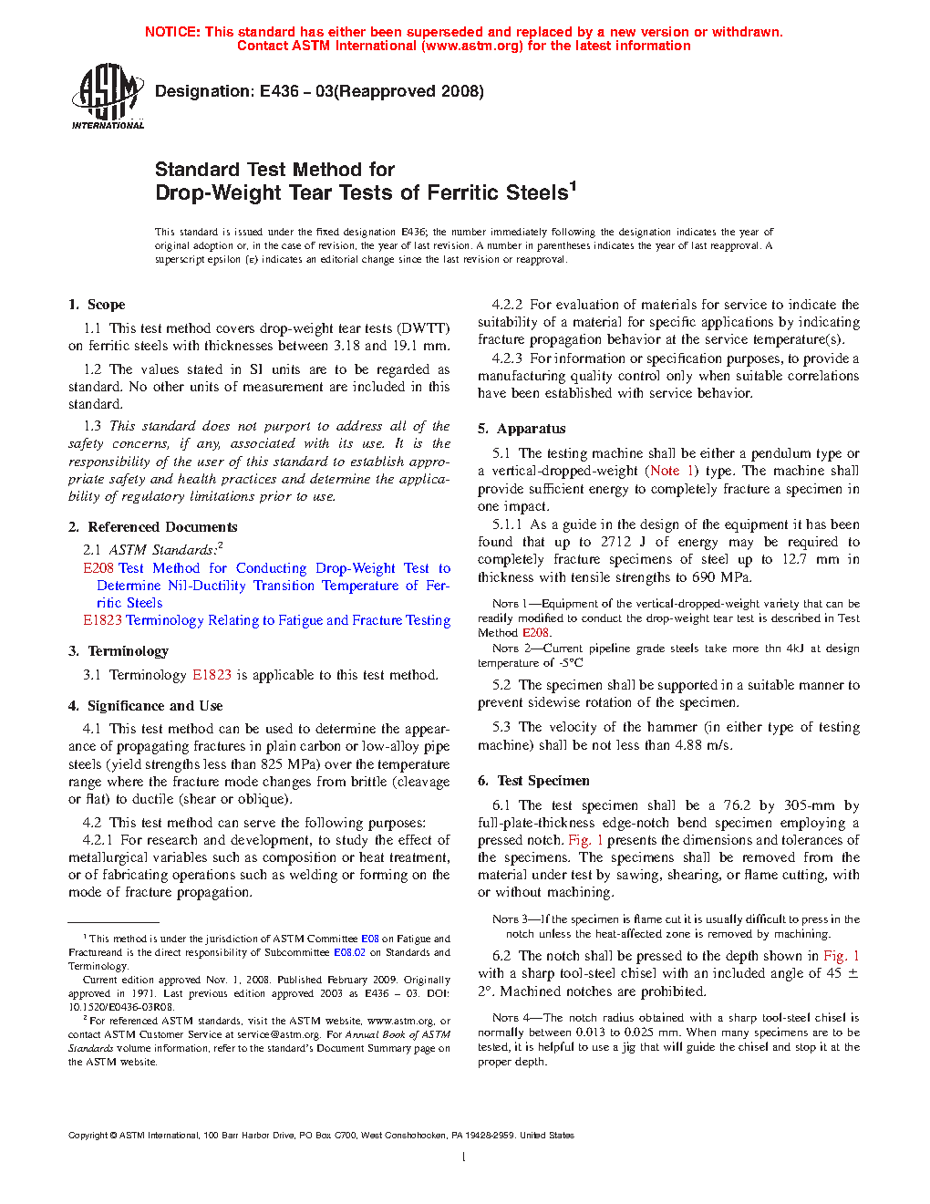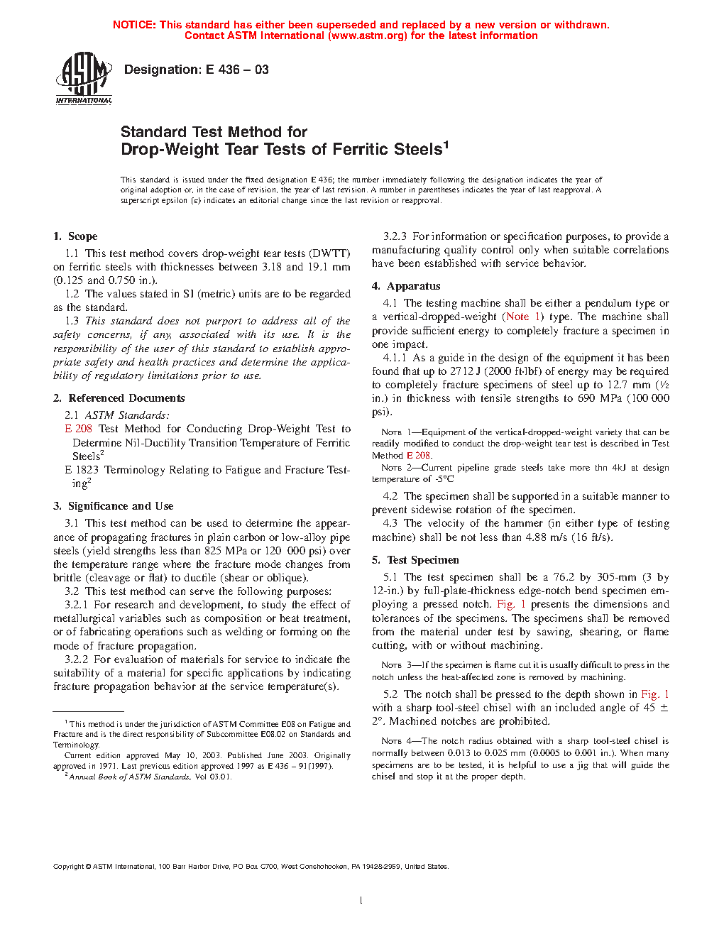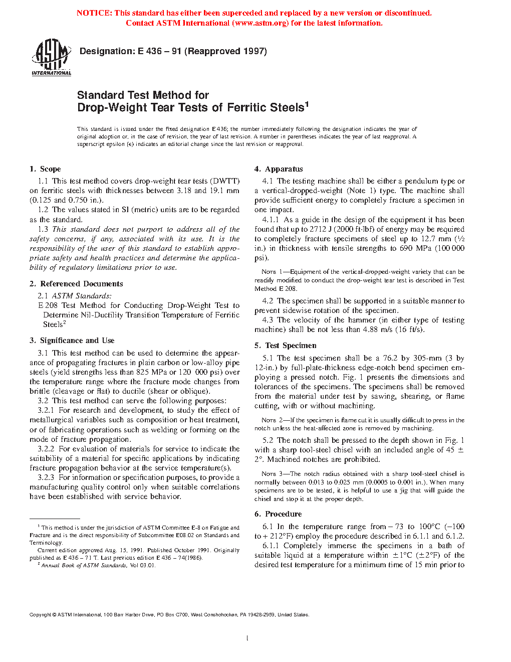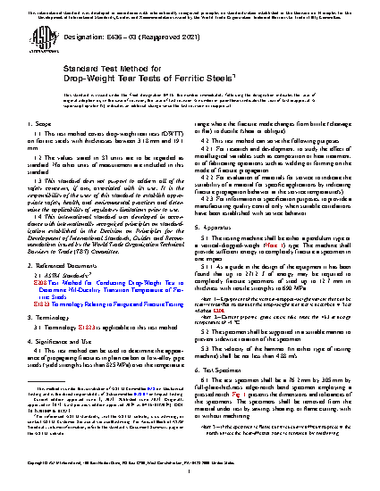 1.1 This test method covers drop-weight tear tests (DWTT) on ferritic steels with thicknesses between 3.18 mm and 19.1 mm.