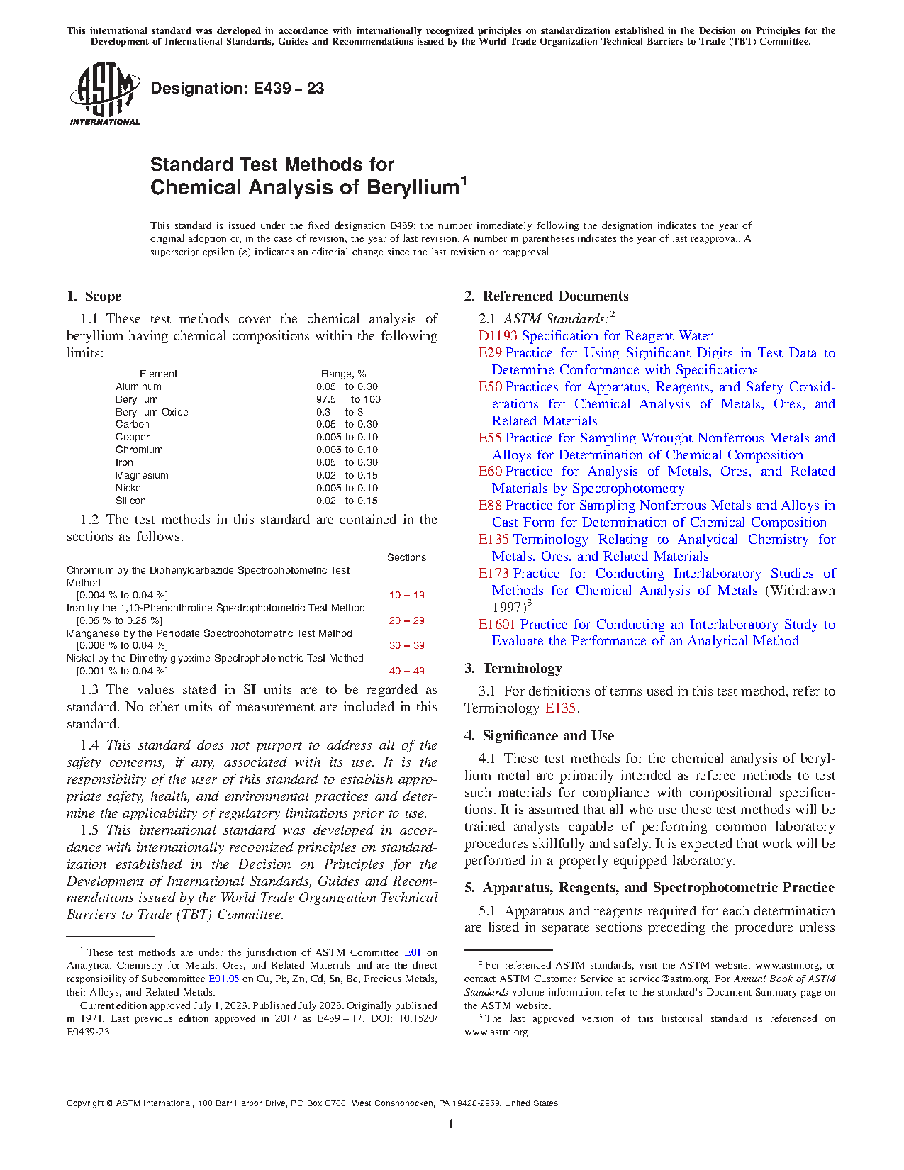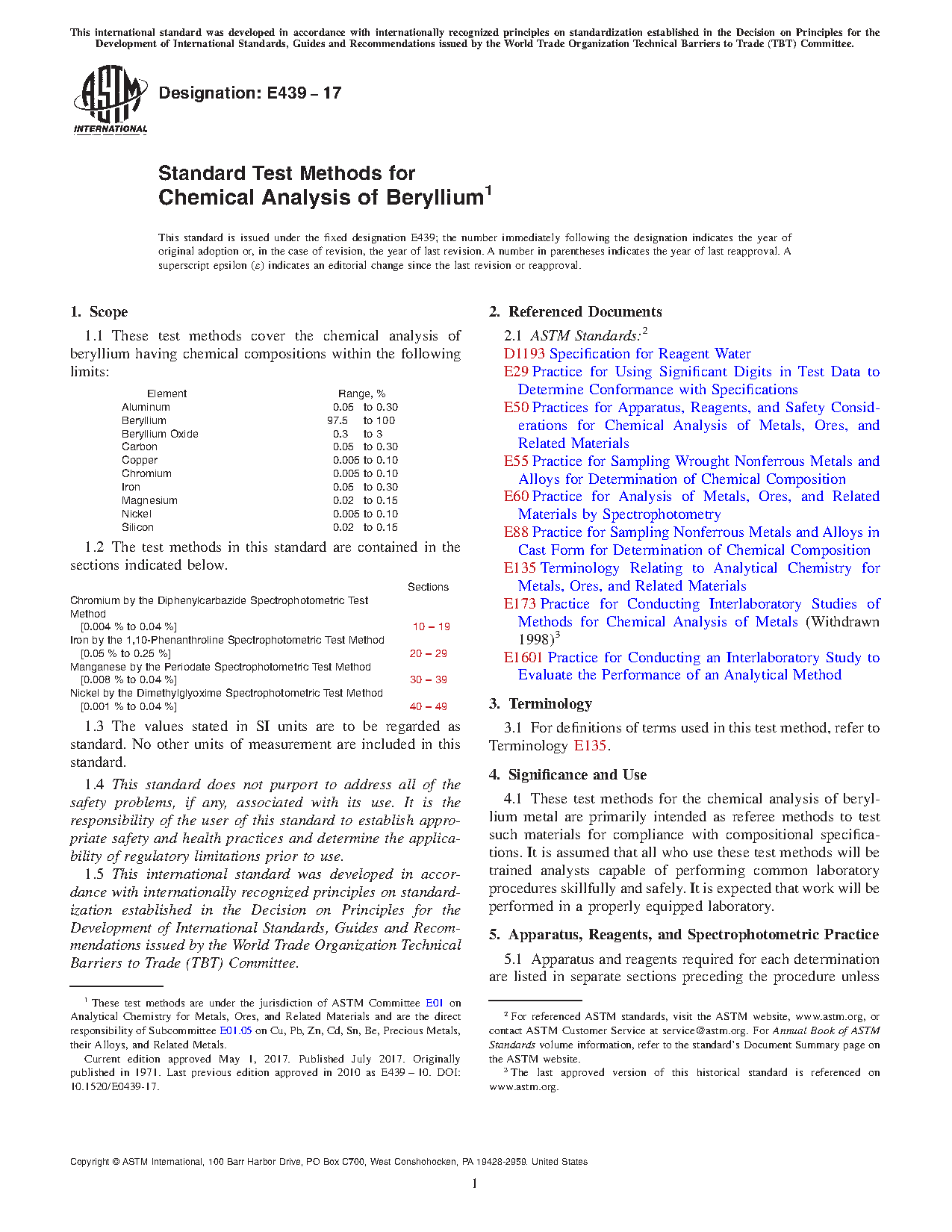These test methods for the chemical analysis of beryllium metal are primarily intended as referee methods to test such materials for compliance with compositional specifications. It is assumed that all who use these test methods will be trained analysts capable of performing common laboratory procedures skillfully and safely. It is expected that work will be performed in a properly equipped laboratory.