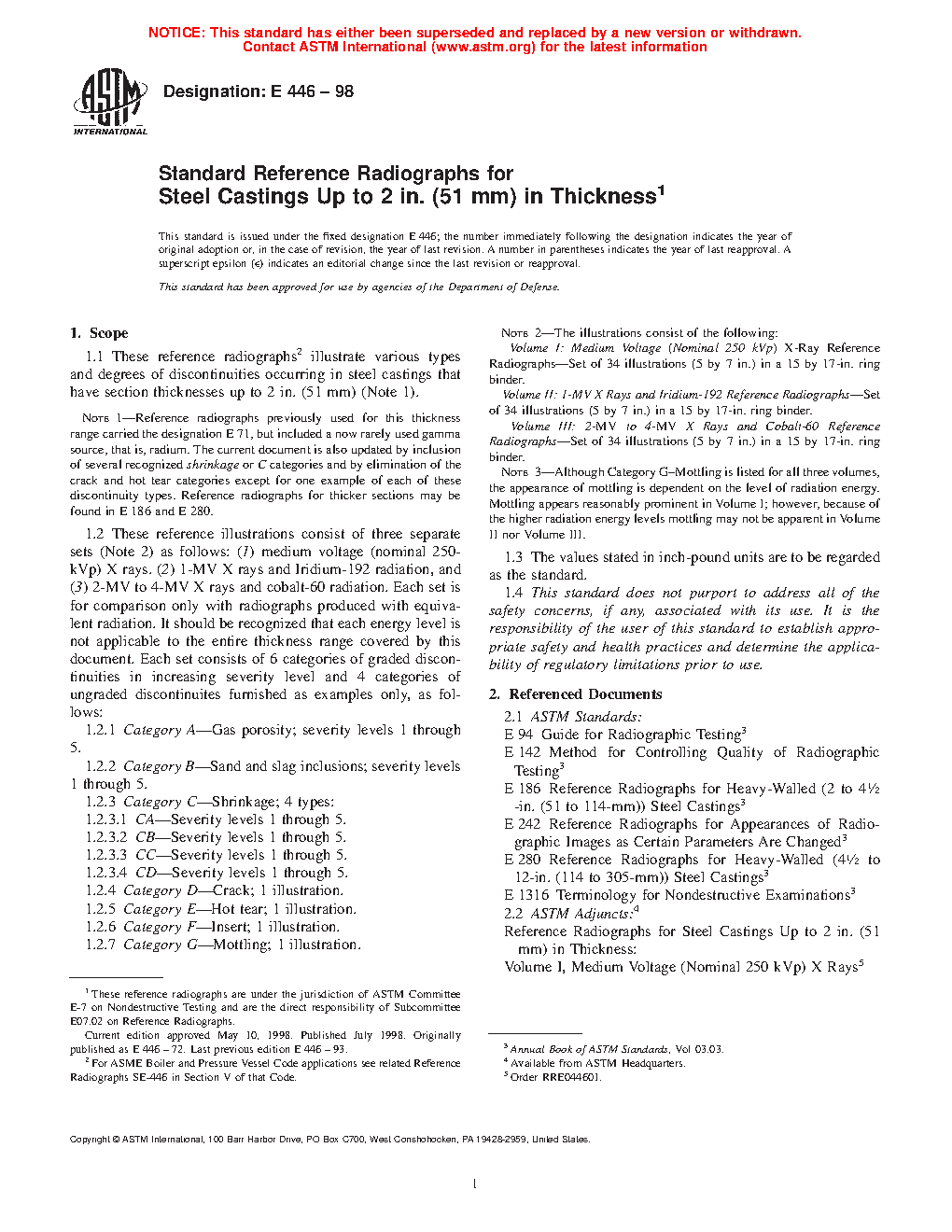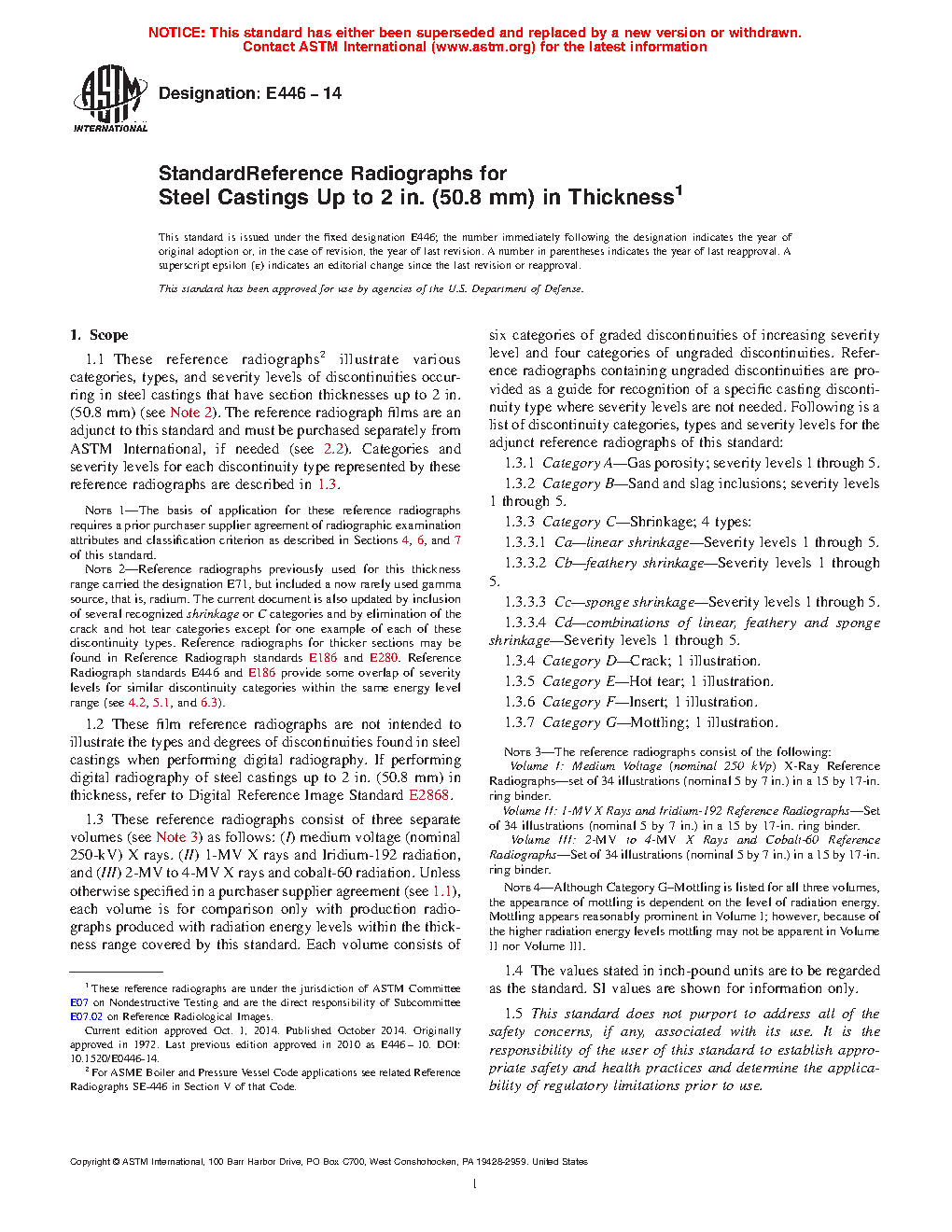 Note 2: Reference radiographs previously used for this thickness range carried the designation E71, but included a now rarely used gamma source, that is, radium. The current document is also updated by inclusion of several recognized shrinkage or C categories and by elimination of the crack and hot tear categories, except for one example of each of these discontinuity types. Reference radiographs for thicker sections may be found in Reference Radiographs E186 and E280. Reference Radiographs E446 and E186 provide some overlap of severity levels for similar discontinuity categories within the same energy level range (see 4.3, 5.1, and 6.3).