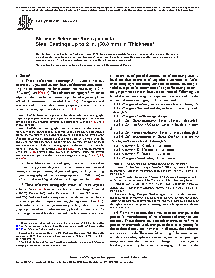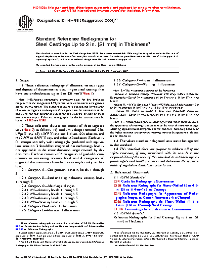 1.1 These reference radiographs2 illustrate various categories, types, and severity levels of discontinuities occurring in steel castings that have section thicknesses up to 2 in. (50.8 mm) (see Note 2). The reference radiograph films are an adjunct to this standard and must be purchased separately from ASTM International, if needed (see 2.2). Categories and severity levels for each discontinuity type represented by these reference radiographs are described in 1.3.