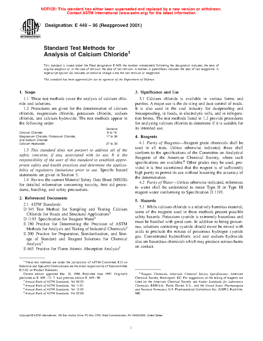 3.1 Calcium chloride is available in various forms and purities. A major use is the de-icing and dust control of roads. It is also used in the coal industry for dustproofing and freezeproofing, in foods, in electrolytic cells, and in refrigeration brines. The test methods listed in 1.2 provide procedures for analyzing calcium chloride to determine if it is suitable for its intended use.