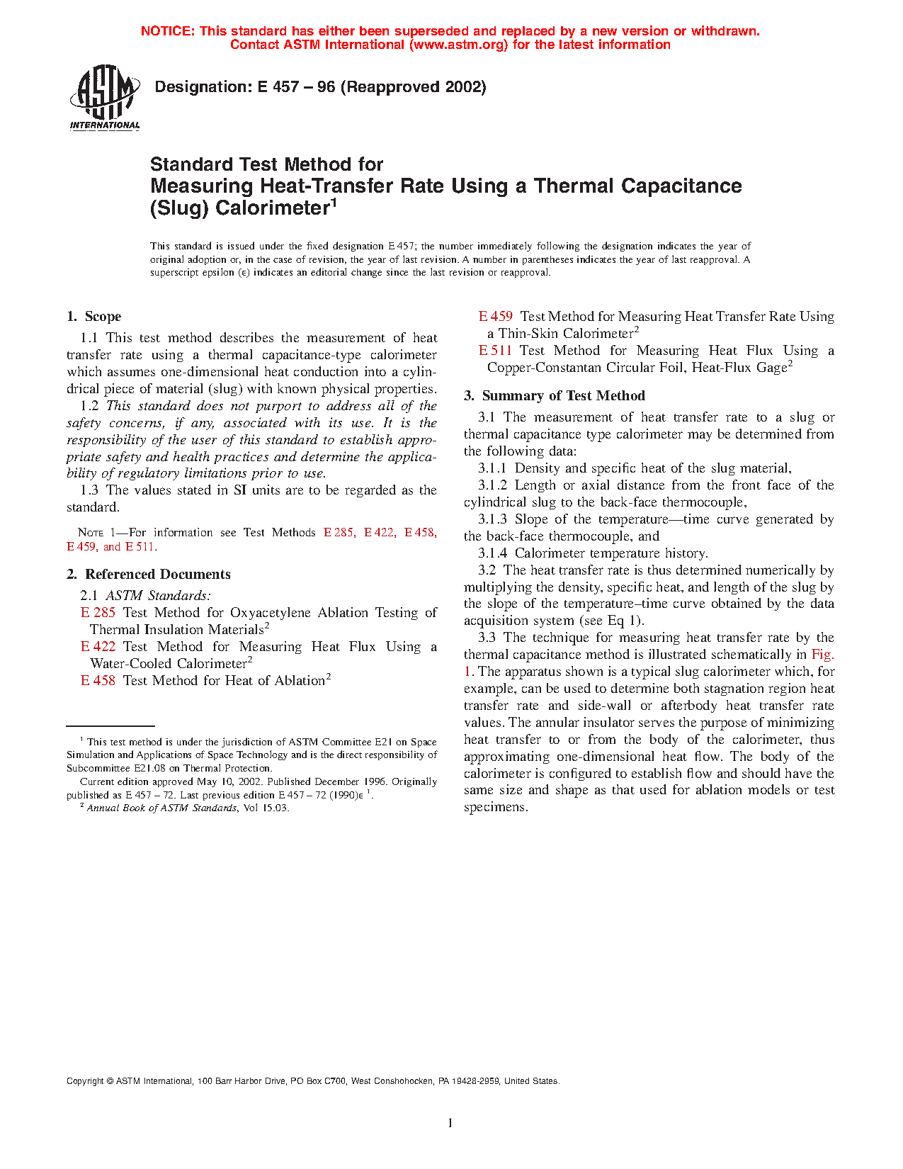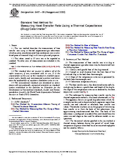 4.3 In the evaluation of high-temperature materials, slug calorimeters are used to measure the heat transfer rate on various parts of the instrumented models, since heat transfer rate is one of the important parameters in evaluating the performance of ablative materials.