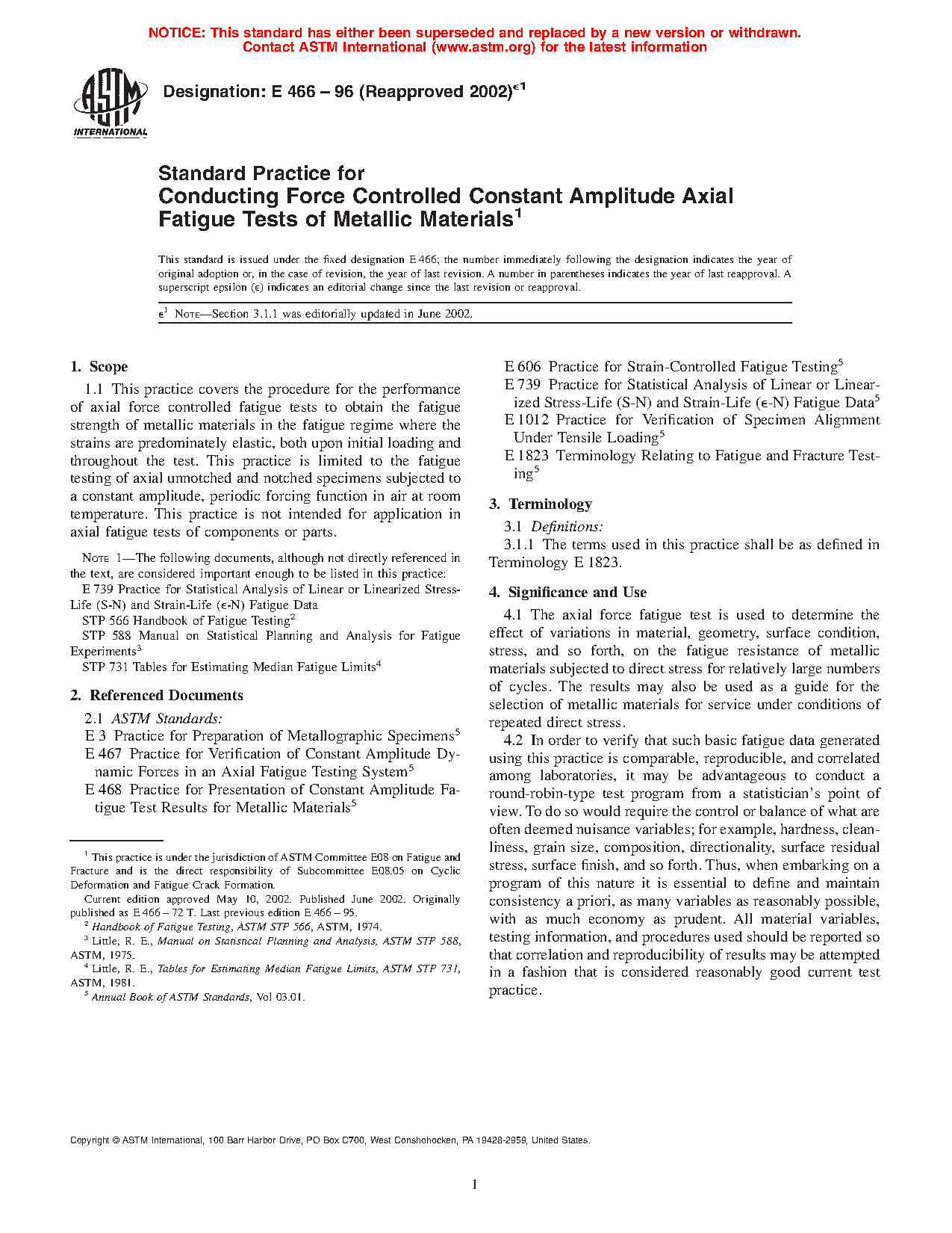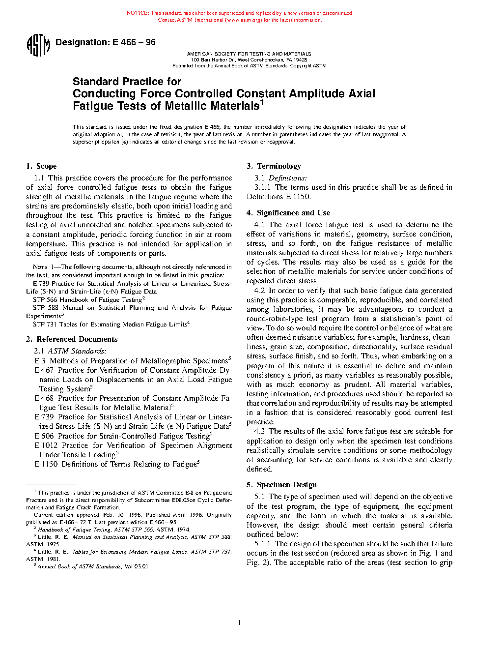 4.3 The results of the axial force fatigue test are suitable for application to design only when the specimen test conditions realistically simulate service conditions or some methodology of accounting for service conditions is available and clearly defined.