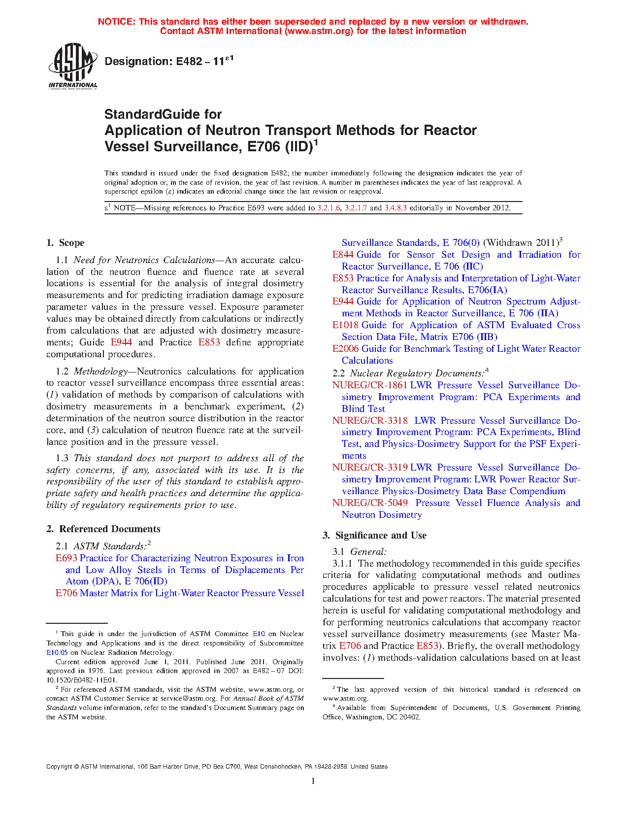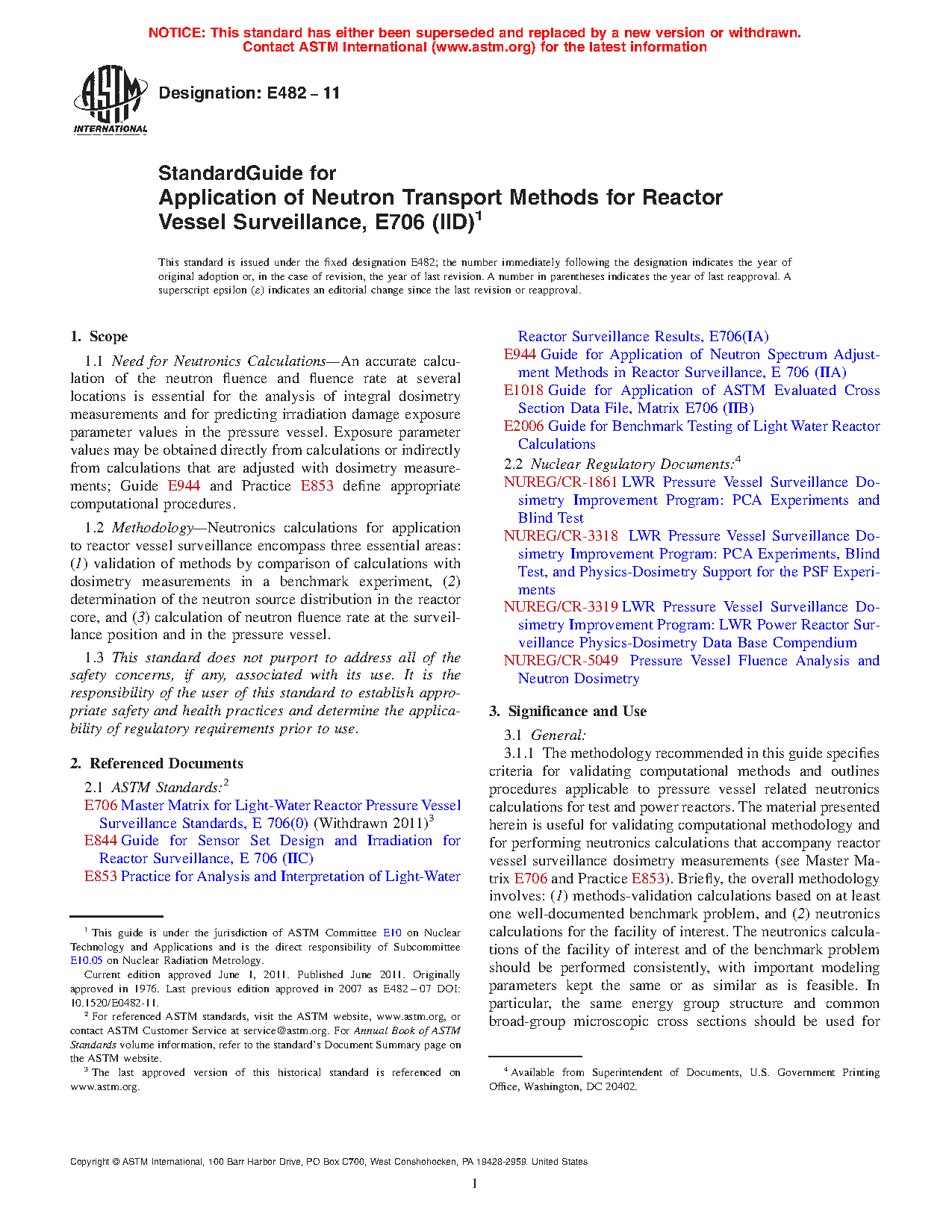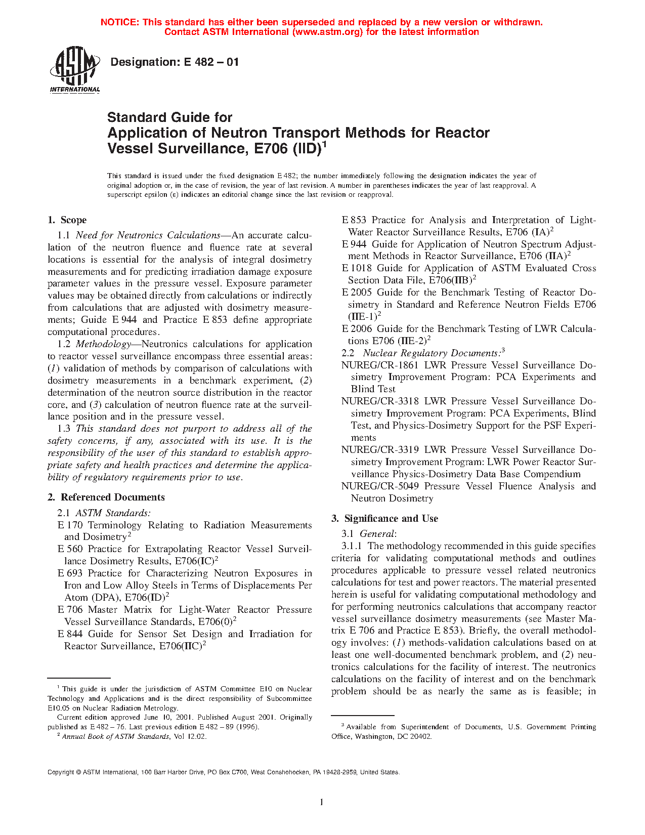 1.2 Methodology—Neutronics calculations for application to reactor vessel surveillance encompass three essential areas: (1) validation of methods by comparison of calculations with dosimetry measurements in a benchmark experiment, (2) determination of the neutron source distribution in the reactor core, and (3) calculation of neutron fluence rate at the surveillance position and in the pressure vessel.