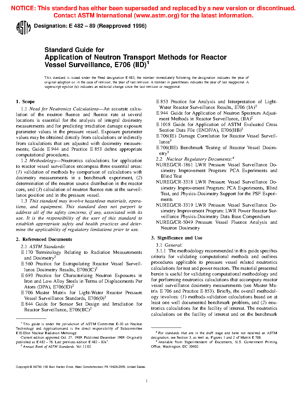 1.1 Need for Neutronics Calculations—An accurate calculation of the neutron fluence and fluence rate at several locations is essential for the analysis of integral dosimetry measurements and for predicting irradiation damage exposure parameter values in the pressure vessel. Exposure parameter values may be obtained directly from calculations or indirectly from calculations that are adjusted with dosimetry measurements; Guide E 944 and Practice E 853 define appropriate computational procedures.