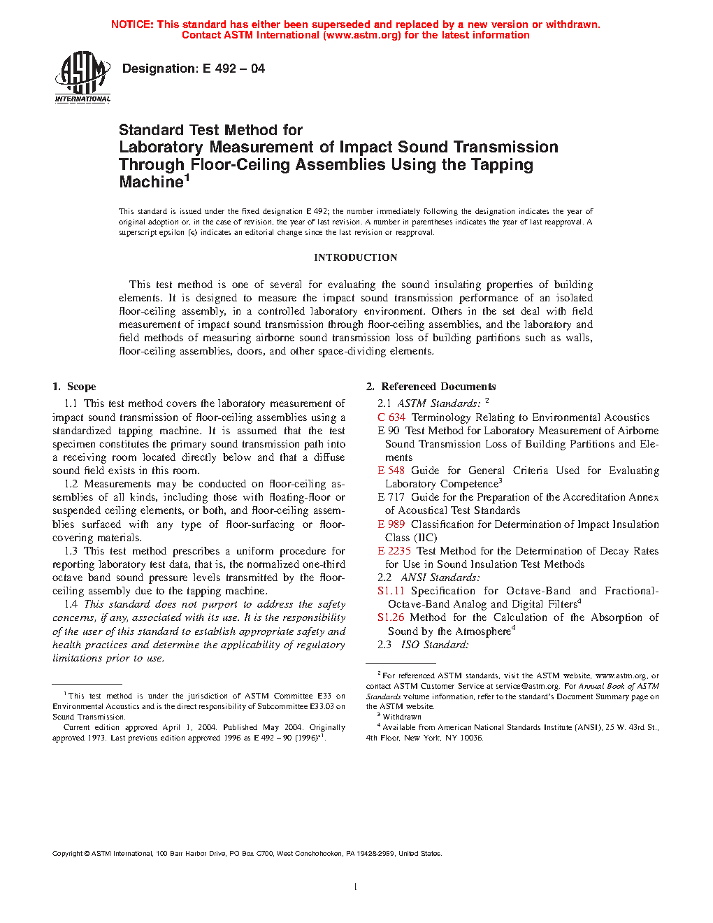 1.1 This test method covers the laboratory measurement of impact sound transmission of floor-ceiling assemblies using a standardized tapping machine. It is assumed that the test specimen constitutes the primary sound transmission path into a receiving room located directly below and that a good approximation to a diffuse sound field exists in this room.