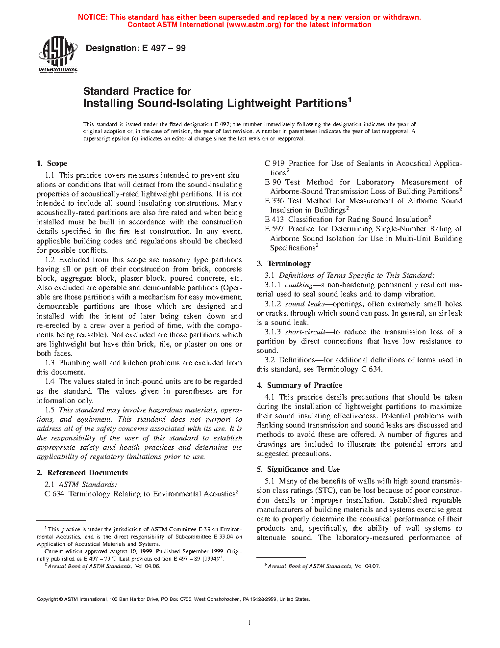 Many of the benefits of walls with high sound transmission class ratings (STC), can be lost because of poor construction details or improper installation. Established reputable manufacturers of building materials and systems exercise great care to properly determine the acoustical performance of their products and, specifically, the ability of wall systems to attenuate sound. The laboratory-measured performance of partitions will not be achieved in buildings unless both the construction details of the acoustically rated wall and the installation details such as described in this procedure are strictly followed. This practice is intended to emphasize several factors that can substantially reduce the sound insulation of an otherwise good wall and to illustrate satisfactory solutions.
