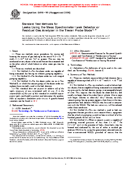 1.1 This practice covers procedures for testing and locating the sources of gas leaking at the rate of 1 × 10−8 Pa m3/s (1 × 10−9 Std cm 3/s) or greater. The test may be conducted on any object to be tested that can be evacuated and to the other side of which helium or other tracer gas may be applied.