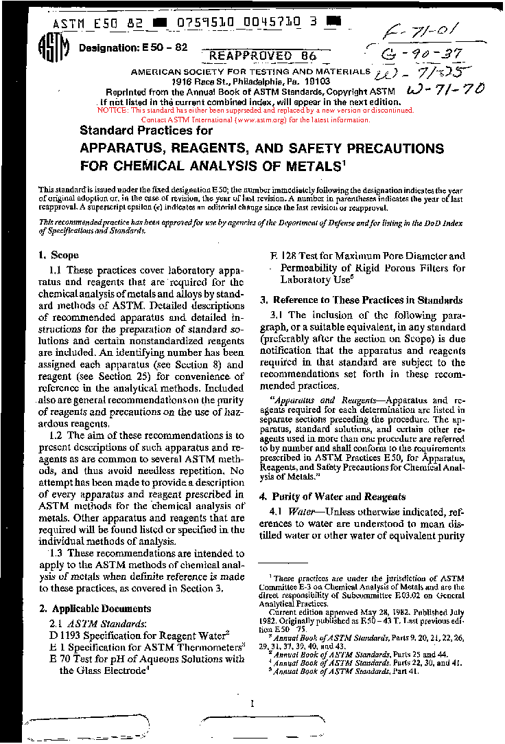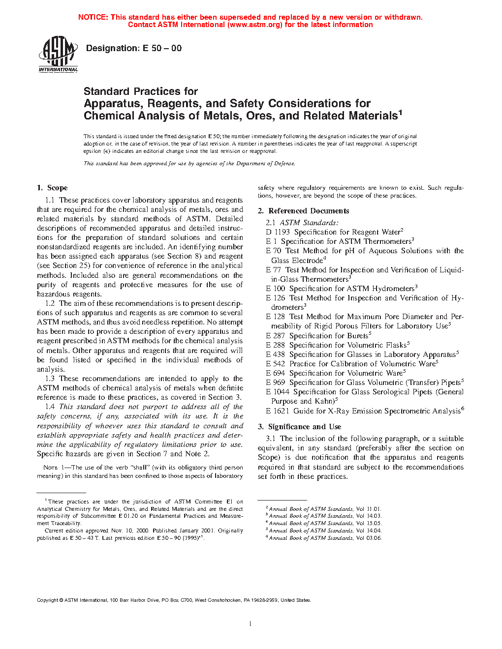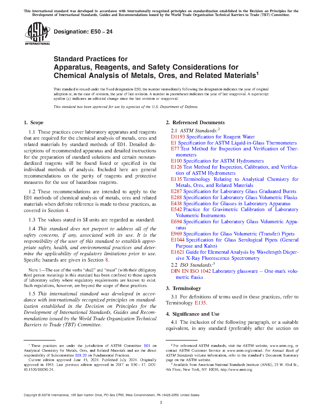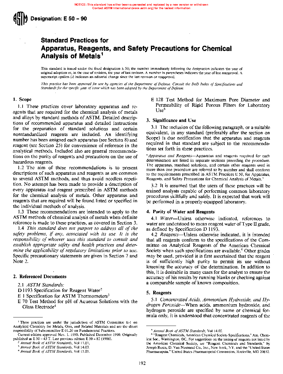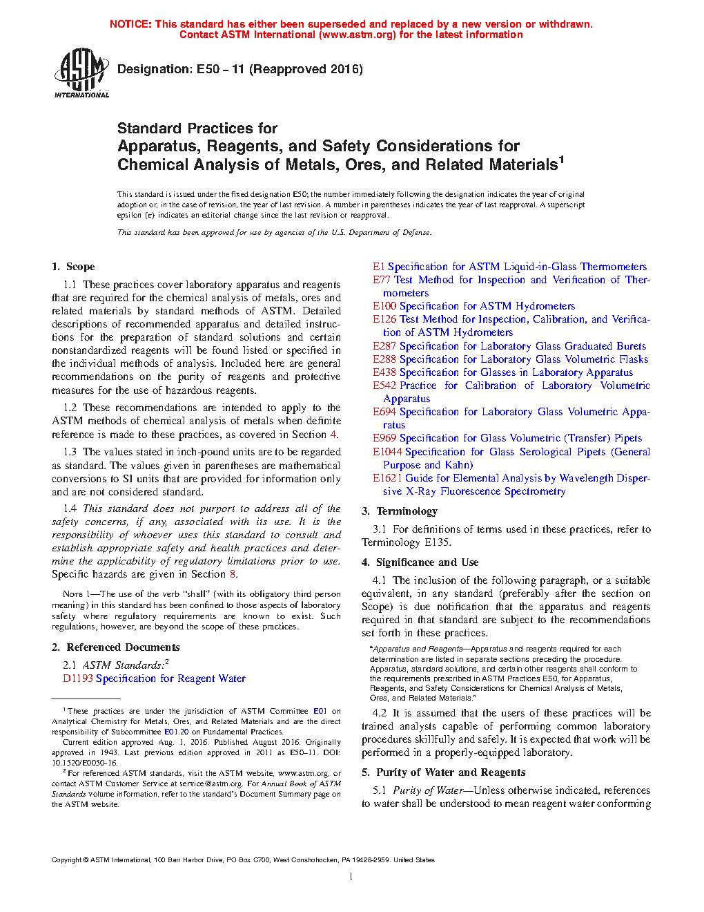| “Apparatus and Reagents—Apparatus and reagents required for each determination are listed in separate sections preceding the procedure. Apparatus, standard solutions, and certain other reagents shall conform to the requirements prescribed in ASTM Practices E50, for Apparatus, Reagents, and Safety Considerations for Chemical Analysis of Metals, Ores, and Related Materials.” |