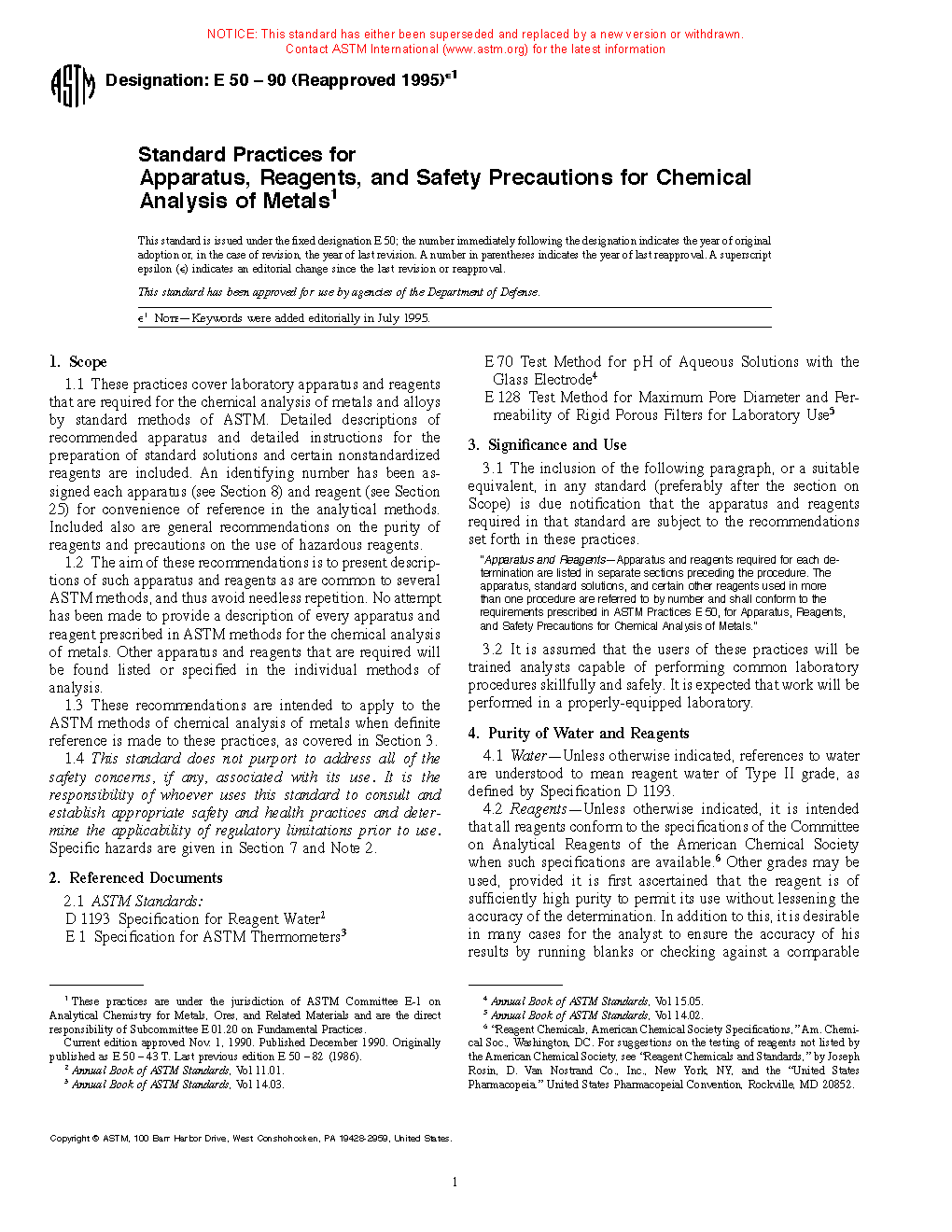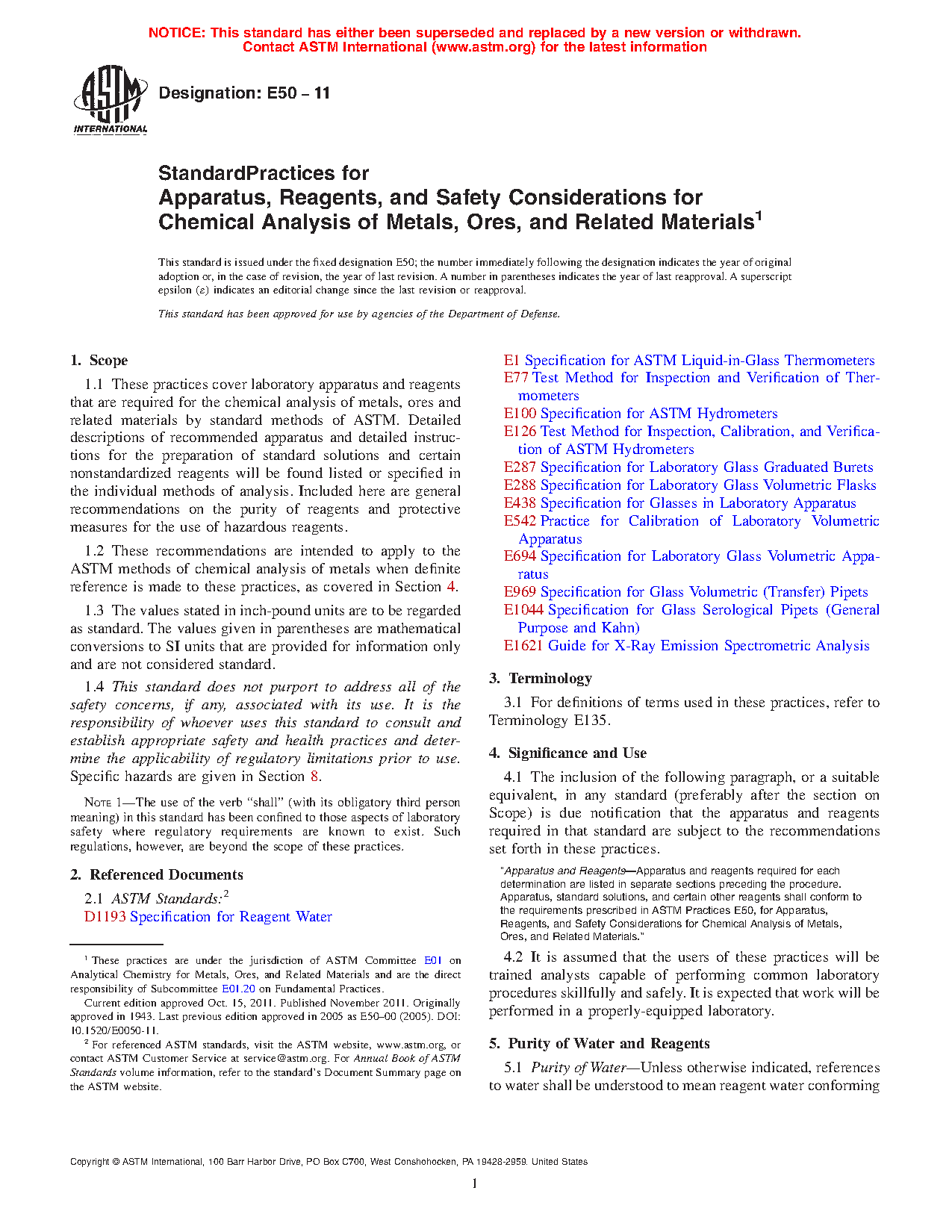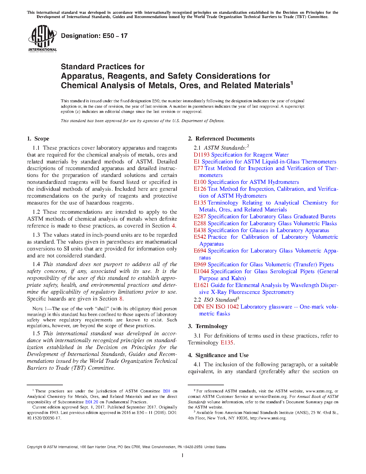 | “Apparatus and Reagents—Apparatus and reagents required for each determination are listed in separate sections preceding the procedure. Apparatus, standard solutions, and certain other reagents shall conform to the requirements prescribed in ASTM Practices E50, for Apparatus, Reagents, and Safety Considerations for Chemical Analysis of Metals, Ores, and Related Materials.” |