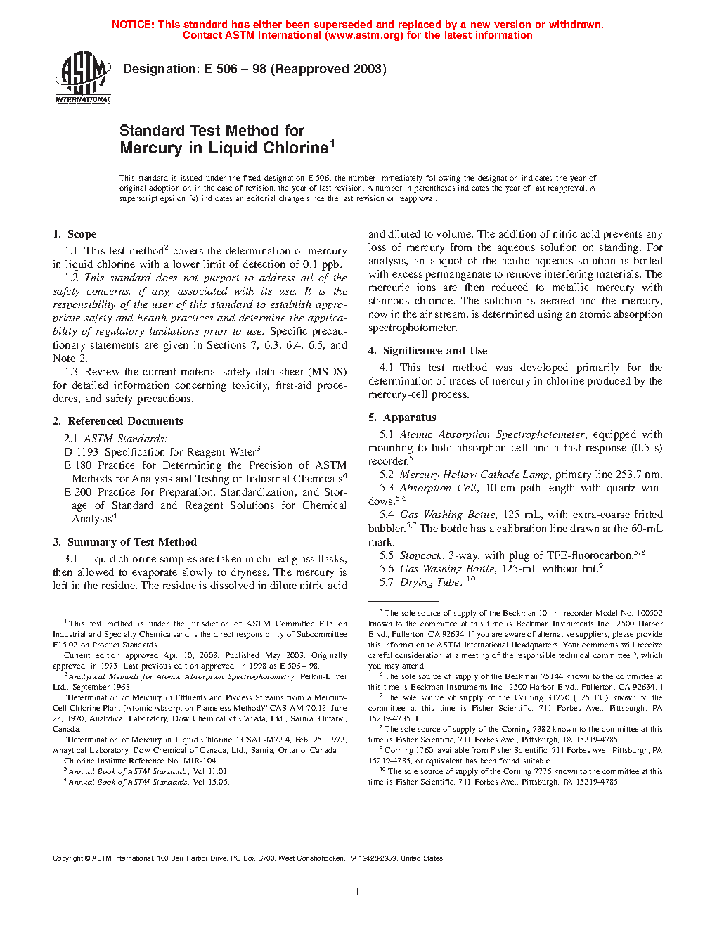 1.1 This test method2 covers the determination of mercury in liquid chlorine with a lower limit of detection of 0.1 µg/L.