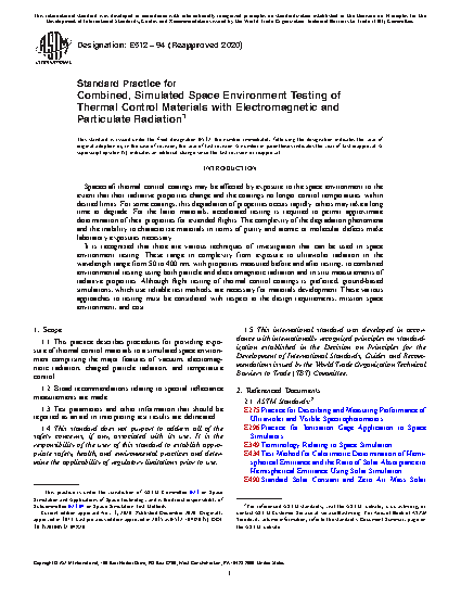 This practice describes the standard procedures for providing exposure of thermal control materials to a simulated space environment comprising of the major features of vacuum, electromagnetic radiation, charged particle radiation, and temperature control. Broad recommendations relating to spectral reflectance measurements, as well as test parameters and other information that should be reported as an aid in interpreting test results are delineated. Specifications are provided for the vacuum system, solar simulator, charged particle sources, safety precautions, and data interpretation.