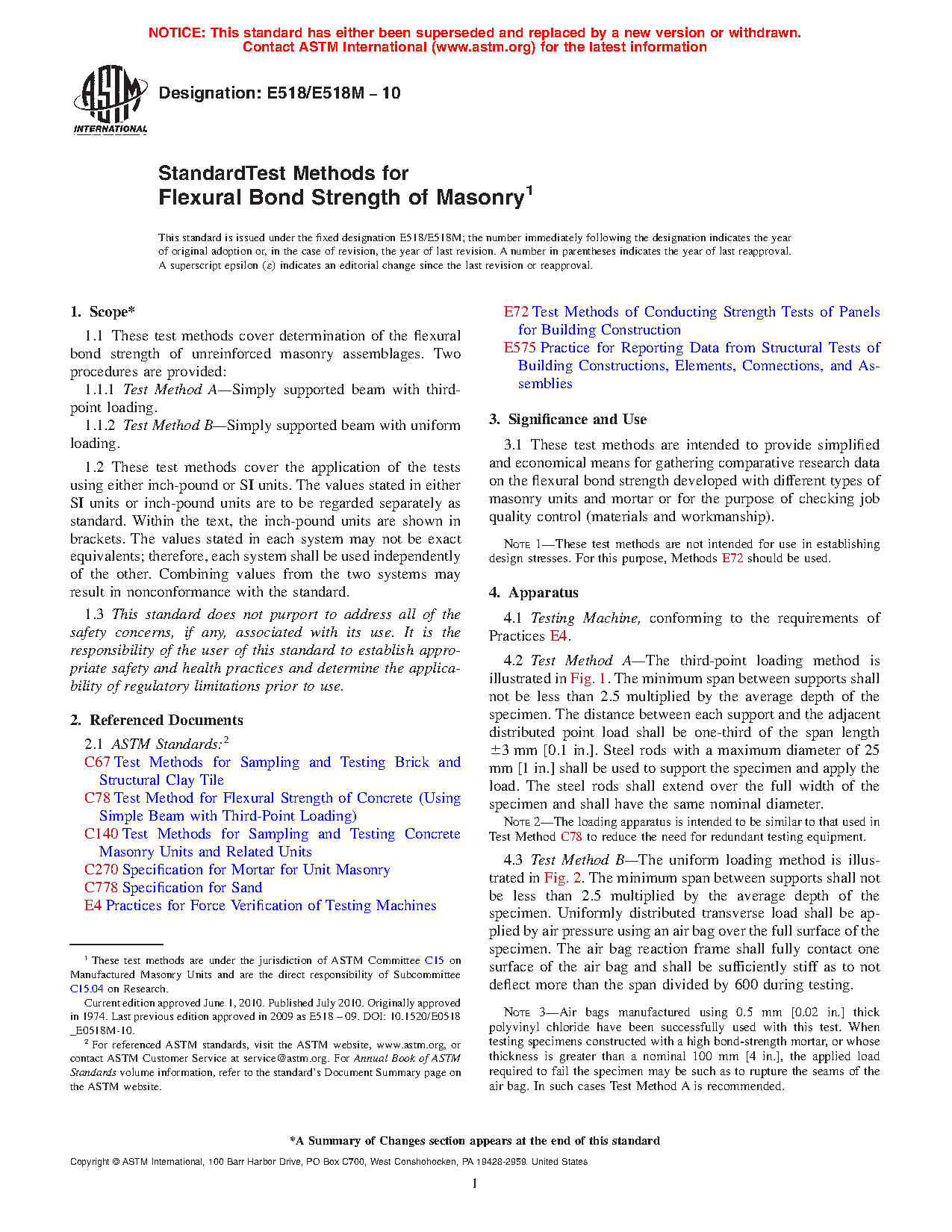 1.1 These test methods cover determination of the flexural bond strength of unreinforced masonry assemblages. Two procedures are provided: