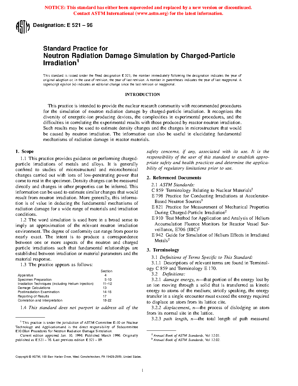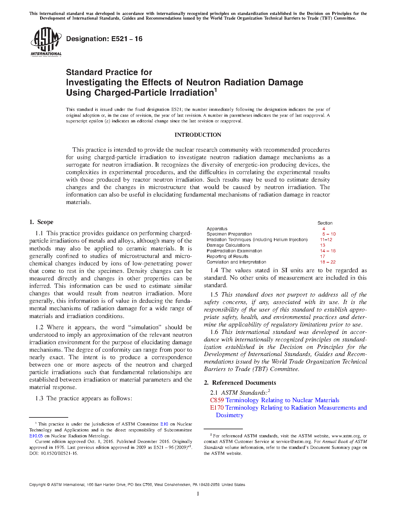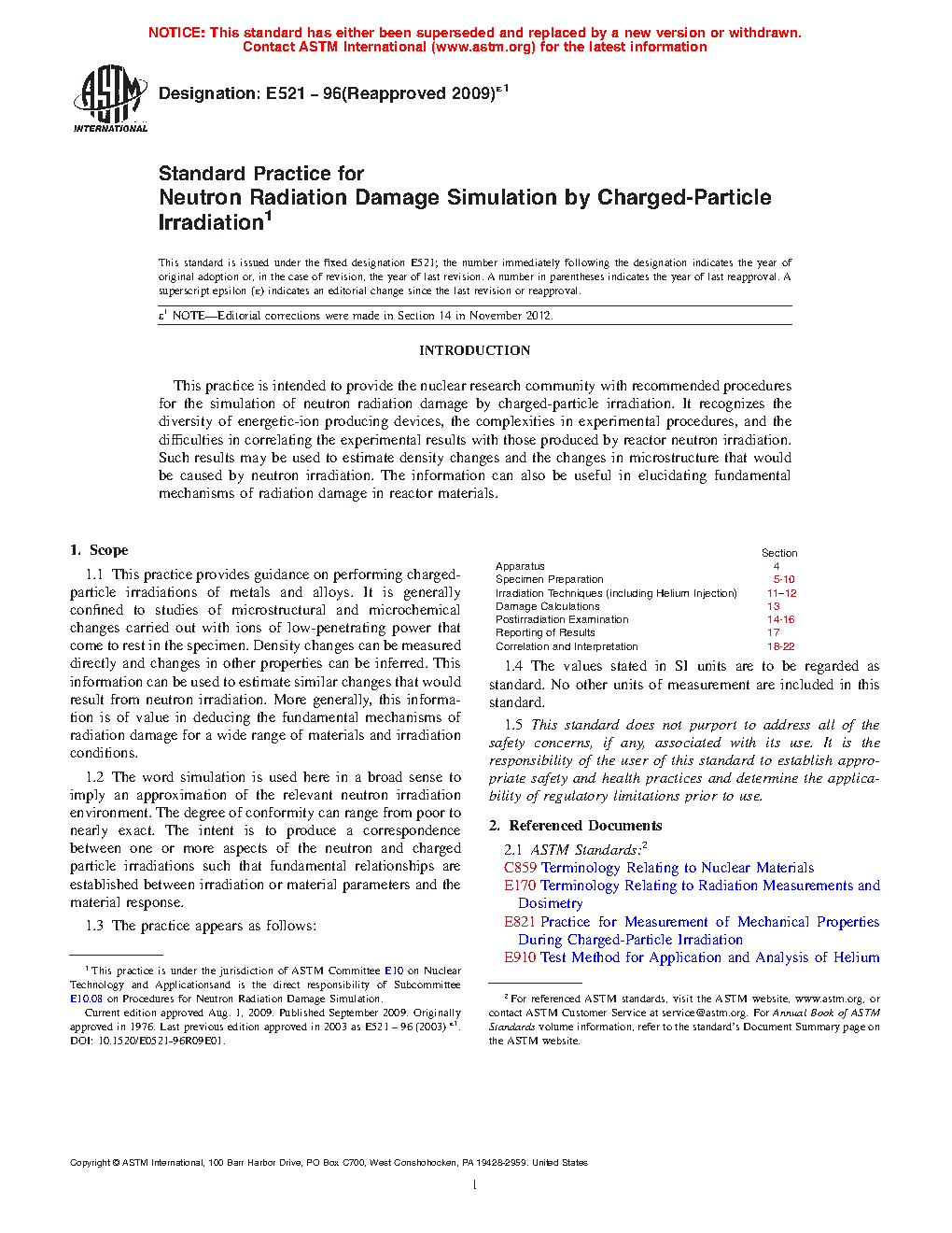 Sections Apparatus 4 Specimen Preparation 5-10 Irradiation Techniques (including Helium Injection) 11-12 Damage Calculations 13 Postirradiation Examination 14-16 Reporting of Results 17 Correlation and Interpretation 18-221.4 This standard does not purport to address all of the safety concerns, if any, associated with its use. It is the responsibility of the user of this standard to establish appropriate safety and health practices and determine the applicability of regulatory limitations prior to use.