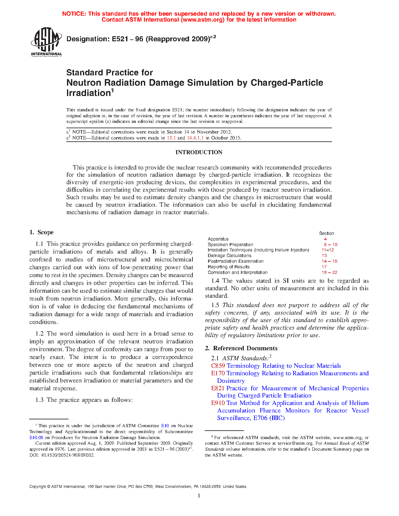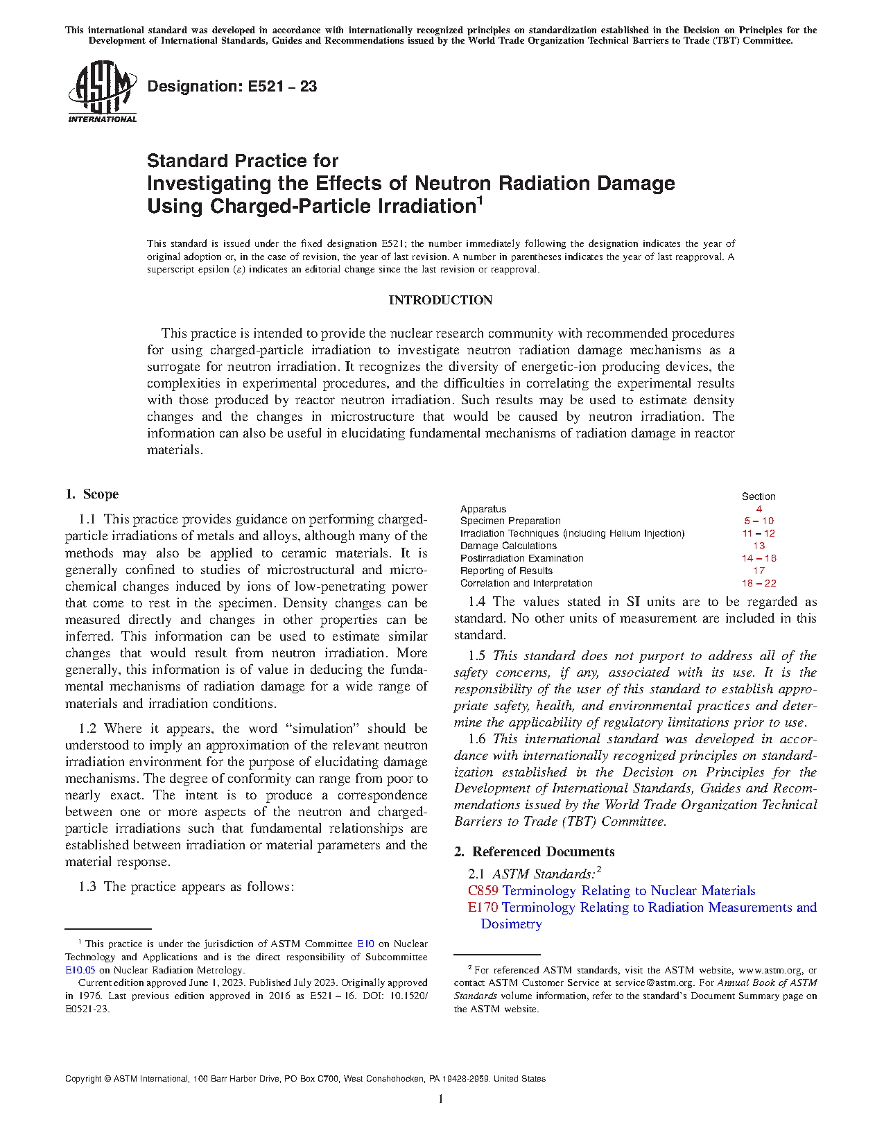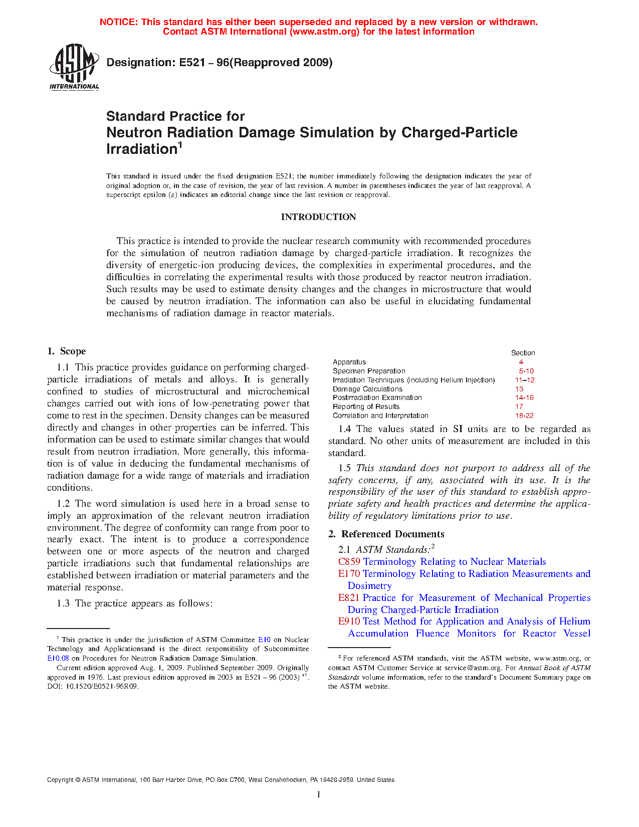 Sections Apparatus 4 Specimen Preparation 5-10 Irradiation Techniques (including Helium Injection) 11-12 Damage Calculations 13 Postirradiation Examination 14-16 Reporting of Results 17 Correlation and Interpretation 18-221.4 This standard does not purport to address all of the safety concerns, if any, associated with its use. It is the responsibility of the user of this standard to establish appropriate safety and health practices and determine the applicability of regulatory limitations prior to use.