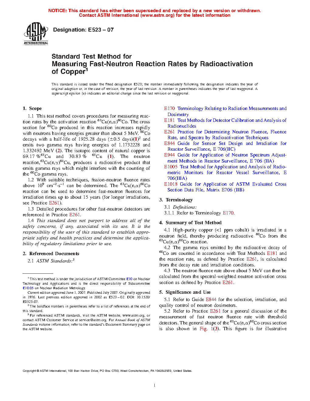 5.2 Refer to Practice E261 for a general discussion of the measurement of fast neutron fluence rate with threshold detectors. The general shape of the 63Cu(n,a) 60Co cross section is also shown in Fig. 1 (3, 4, 5) along with a comparison to the current experimental database (6). This figure is for illustrative purposes only to indicate the range of the response of the 63Cu(n,a)60Co reaction. Refer to Guide E1018 for descriptions of recommended tabulated dosimetry cross sections.