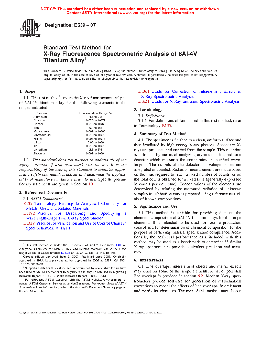 1.1 This test method2 covers the X-ray fluorescence analysis of titanium alloys for the following elements in the ranges indicated: