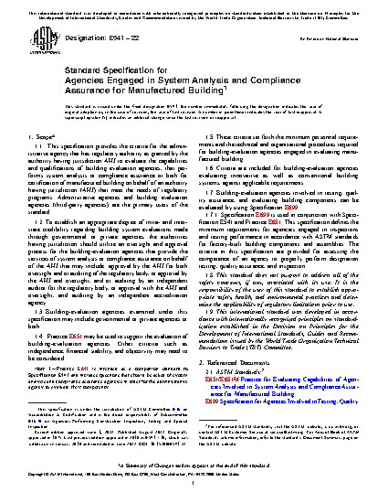 1.1 This specification was initiated to meet the needs of regulatory programs for the certification of manufactured building. The various statutes differ somewhat in the responsibilities assigned to the administrative agency responsible for implementing the rules and regulations for manufactured building. The administrative agency may utilize the services and facilities of building-evaluation agencies in carrying out its responsibilities for evaluating manufactured building systems. By providing criteria for evaluating these agencies, this specification's objective is to (1) utilize the voluntary standards system to provide a common base for the various regulatory approaches employed by the authorities having jurisdiction, and (2) make provision for varying degrees of optional technical support for the certification of manufactured building.