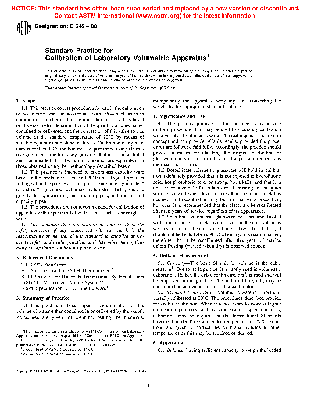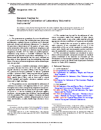 1.1 This practice covers procedures for use in the calibration of volumetric ware, in accordance with Specification E694 such as is in common use in chemical and clinical laboratories. It is based on the gravimetric determination of the quantity of water either contained or delivered, and the conversion of this value to true volume at the standard temperature of 20°C by means of suitable equations and standard tables. Calibration using mercury is excluded. Calibration may be performed using alternative gravimetric methodology, provided that it is demonstrated and documented that the results obtained are equivalent to those obtained using the methodology described herein.