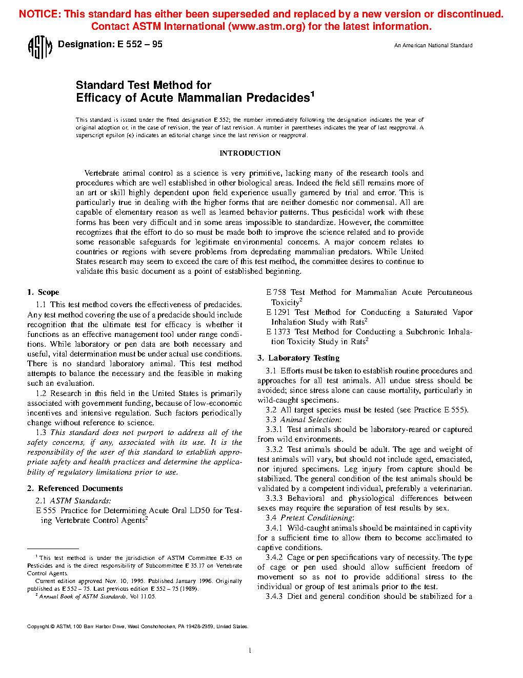 1.1 This test method covers the effectiveness of predacides. Any test method covering the use of a predacide should include recognition that the ultimate test for efficacy is whether it functions as an effective management tool under range conditions. While laboratory or pen data are both necessary and useful, vital determination must be under actual use conditions. There is no standard laboratory animal. This test method attempts to balance the necessary and the feasible in making such an evaluation.