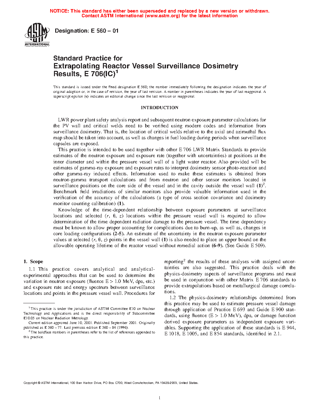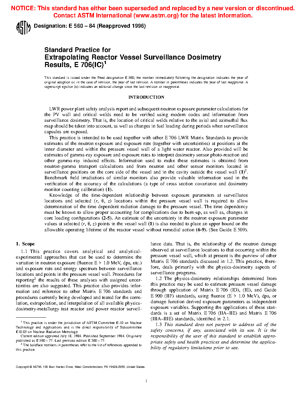 1.2 The physics-dosimetry relationships determined from this practice may be used to estimate pressure vessel damage through application of Practice E 693 and Guide E 900 standards, using fluence (E > 1.0 MeV), dpa, or damage function derived exposure parameters as independent exposure variables. Supporting the application of these standards is E 944, E 1018, E 1005, and E 854 standards, identified in 2.1.