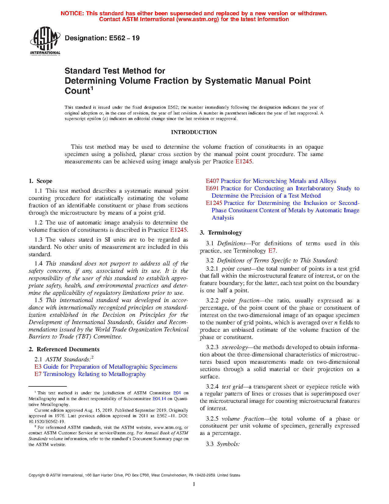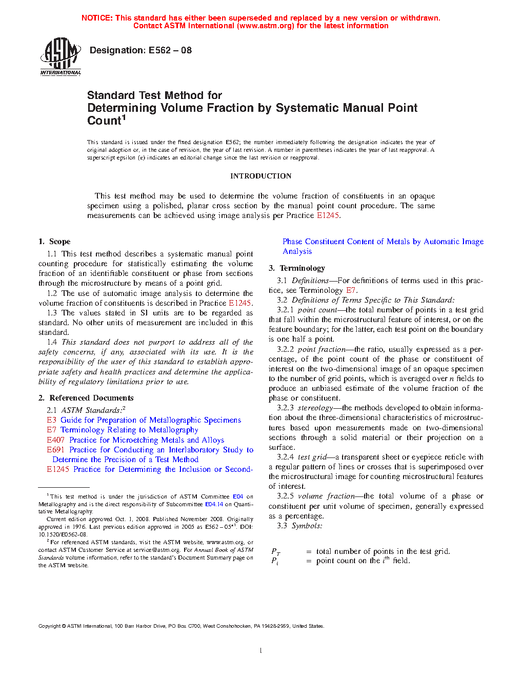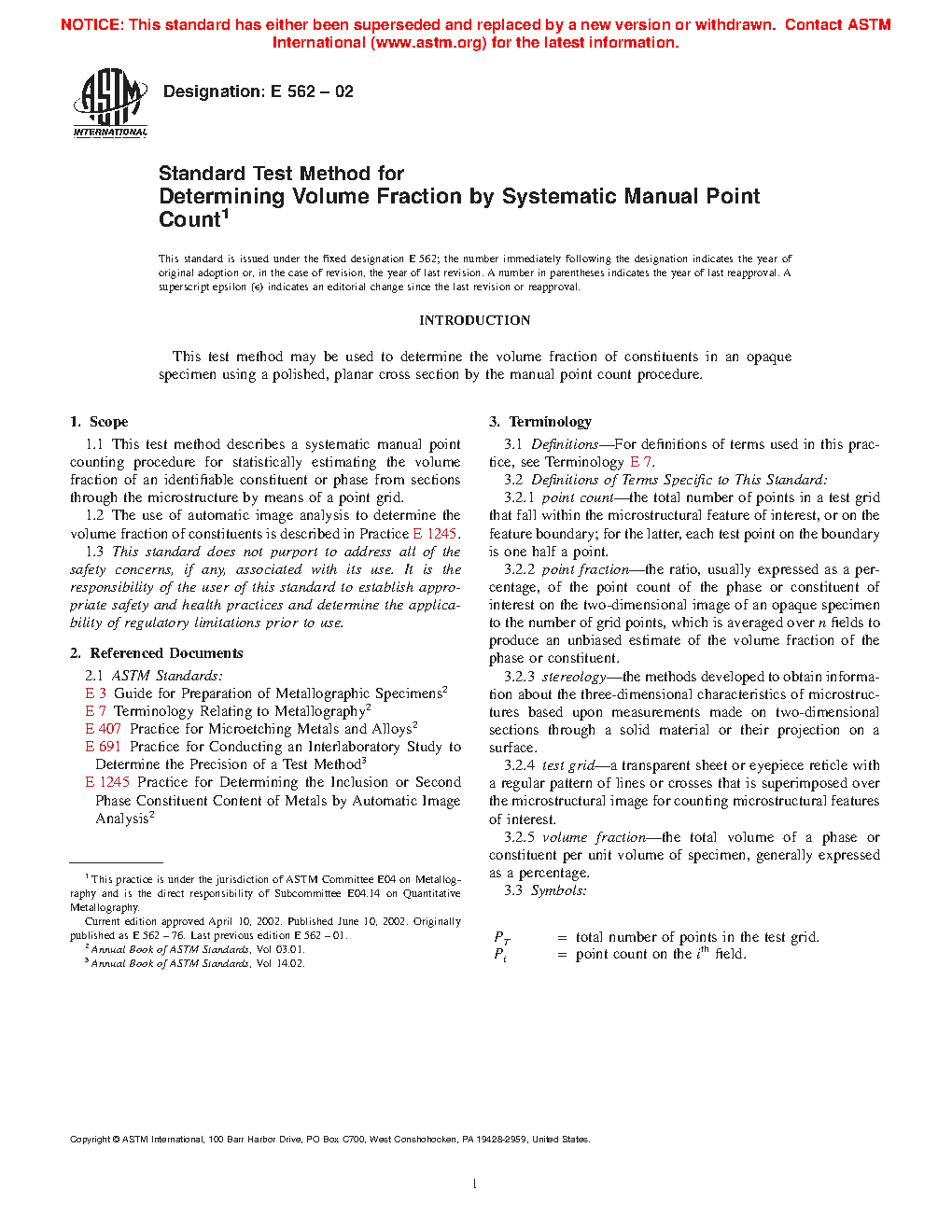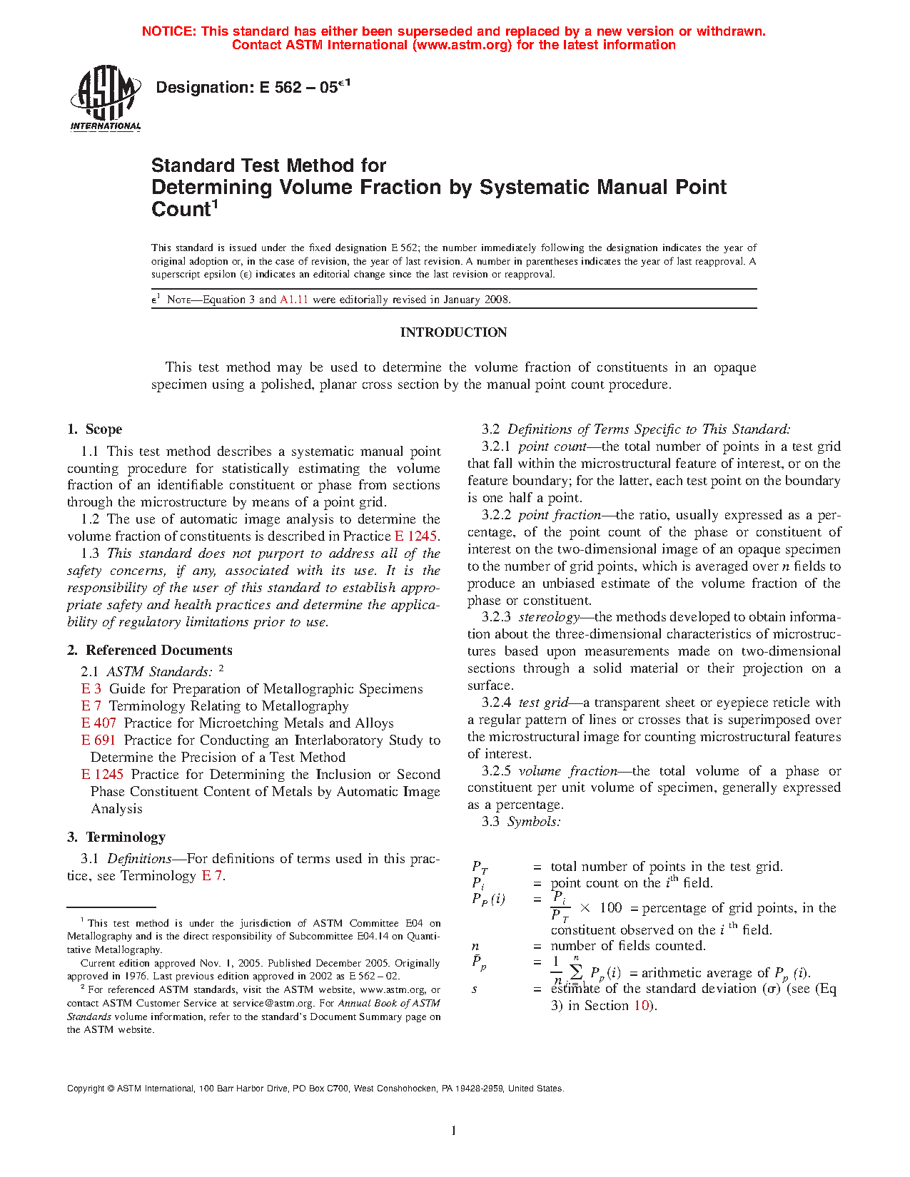 1.1 This test method describes a systematic manual point counting procedure for statistically estimating the volume fraction of an identifiable constituent or phase from sections through the microstructure by means of a point grid.