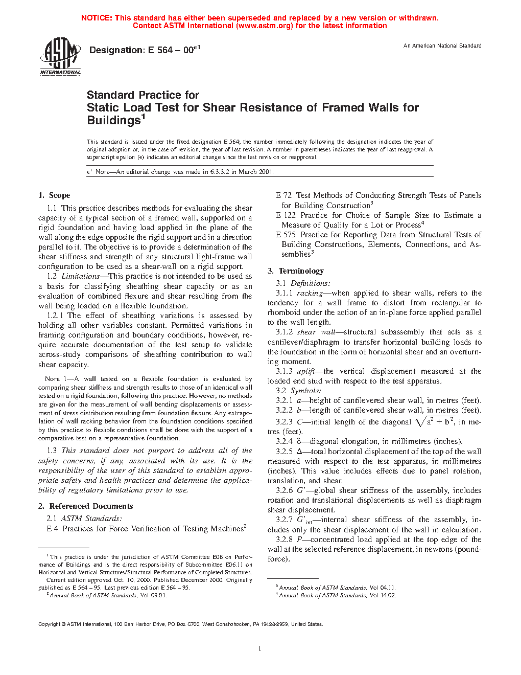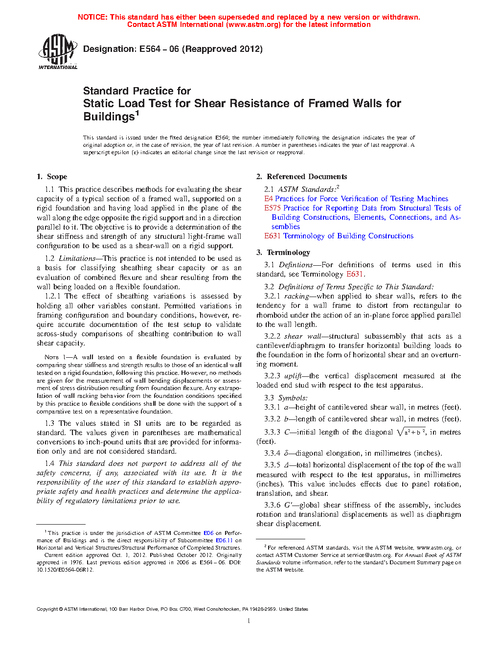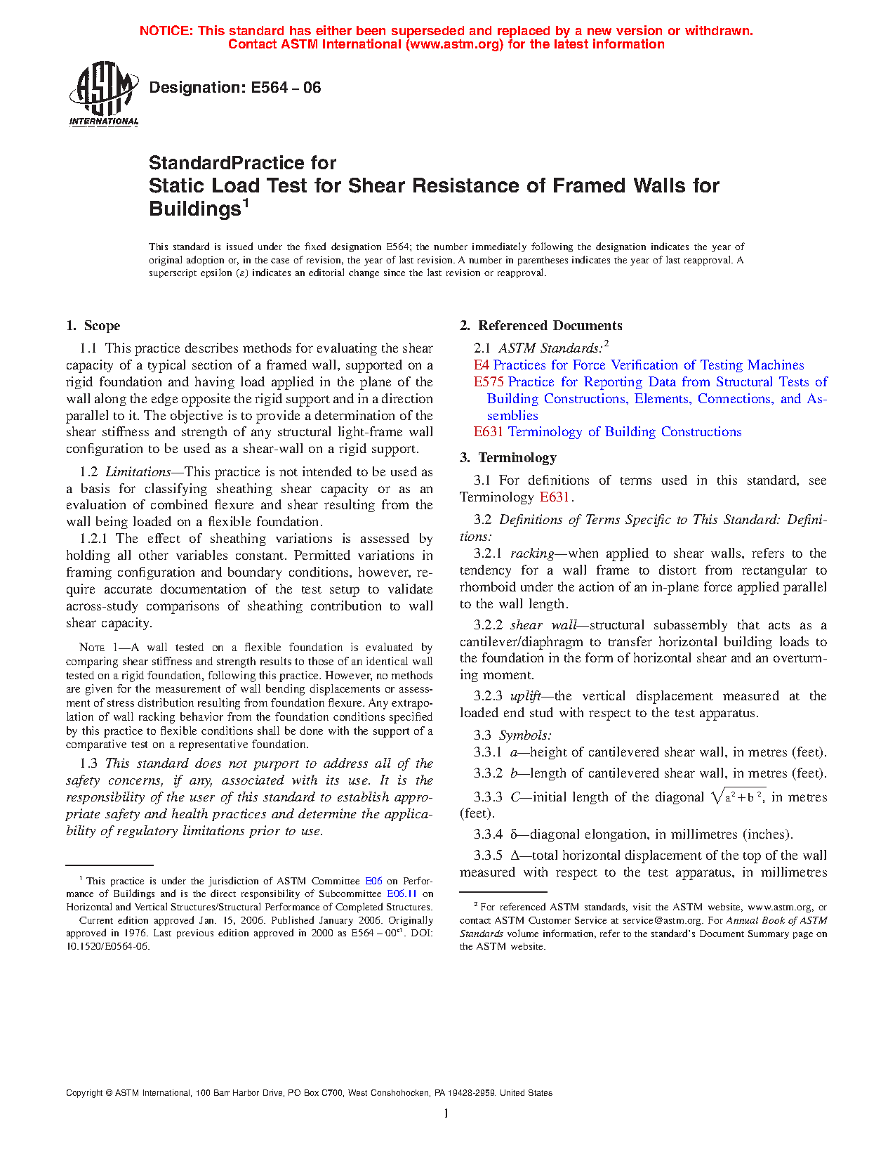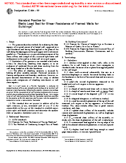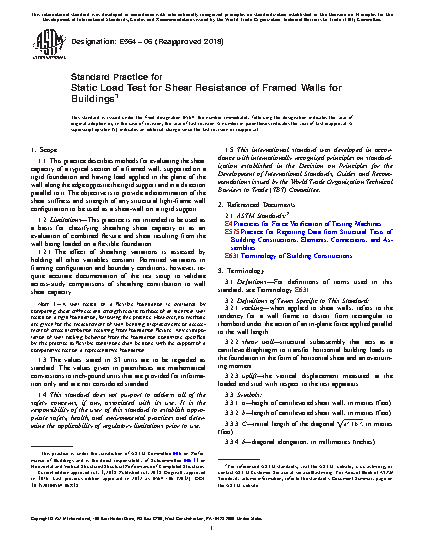 1.1 This practice describes methods for evaluating the shear capacity of a typical section of a framed wall, supported on a rigid foundation and having load applied in the plane of the wall along the edge opposite the rigid support and in a direction parallel to it. The objective is to provide a determination of the shear stiffness and strength of any structural light-frame wall configuration to be used as a shear-wall on a rigid support.