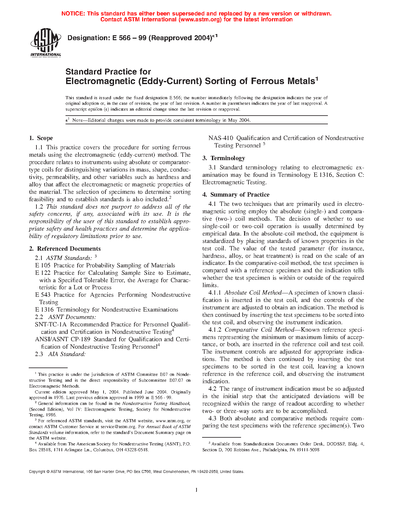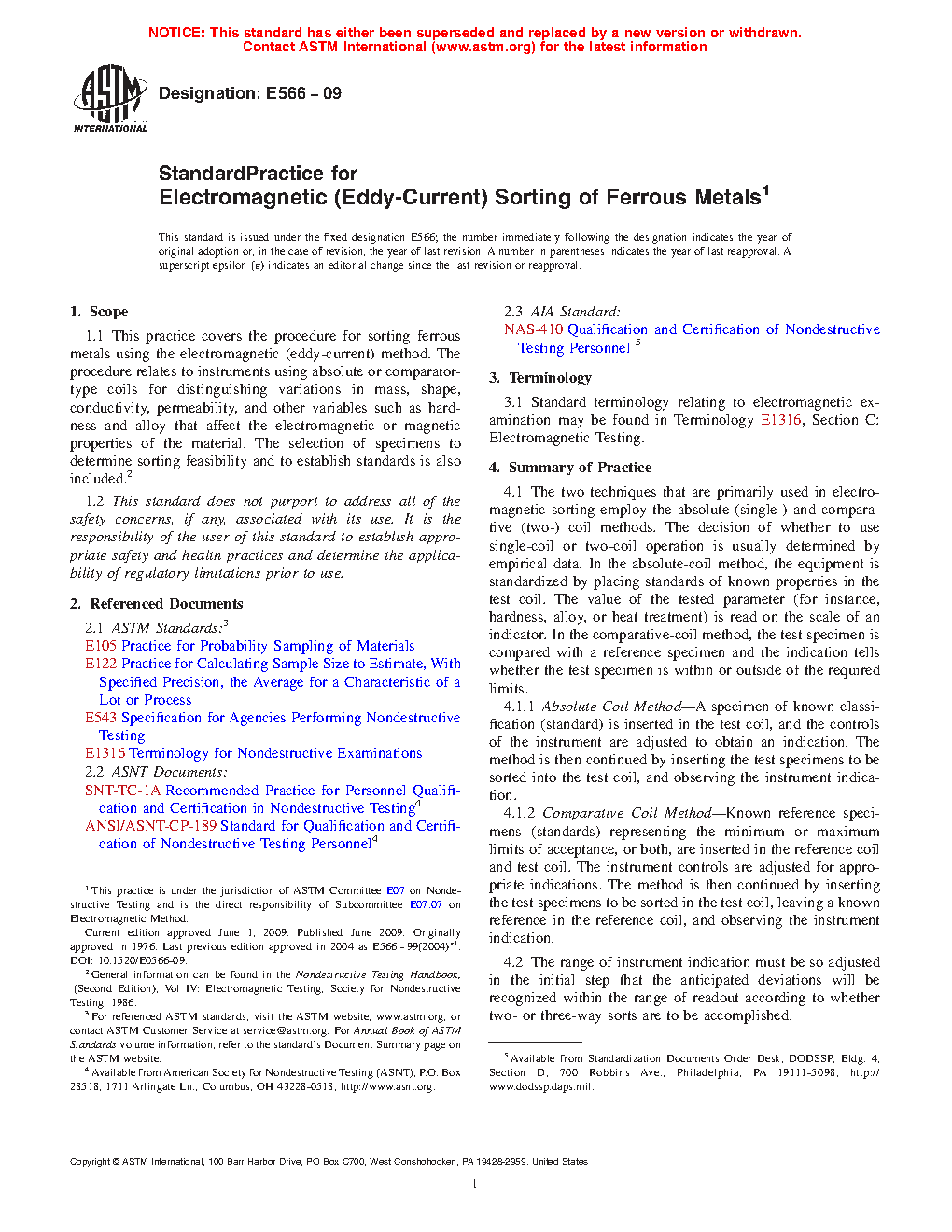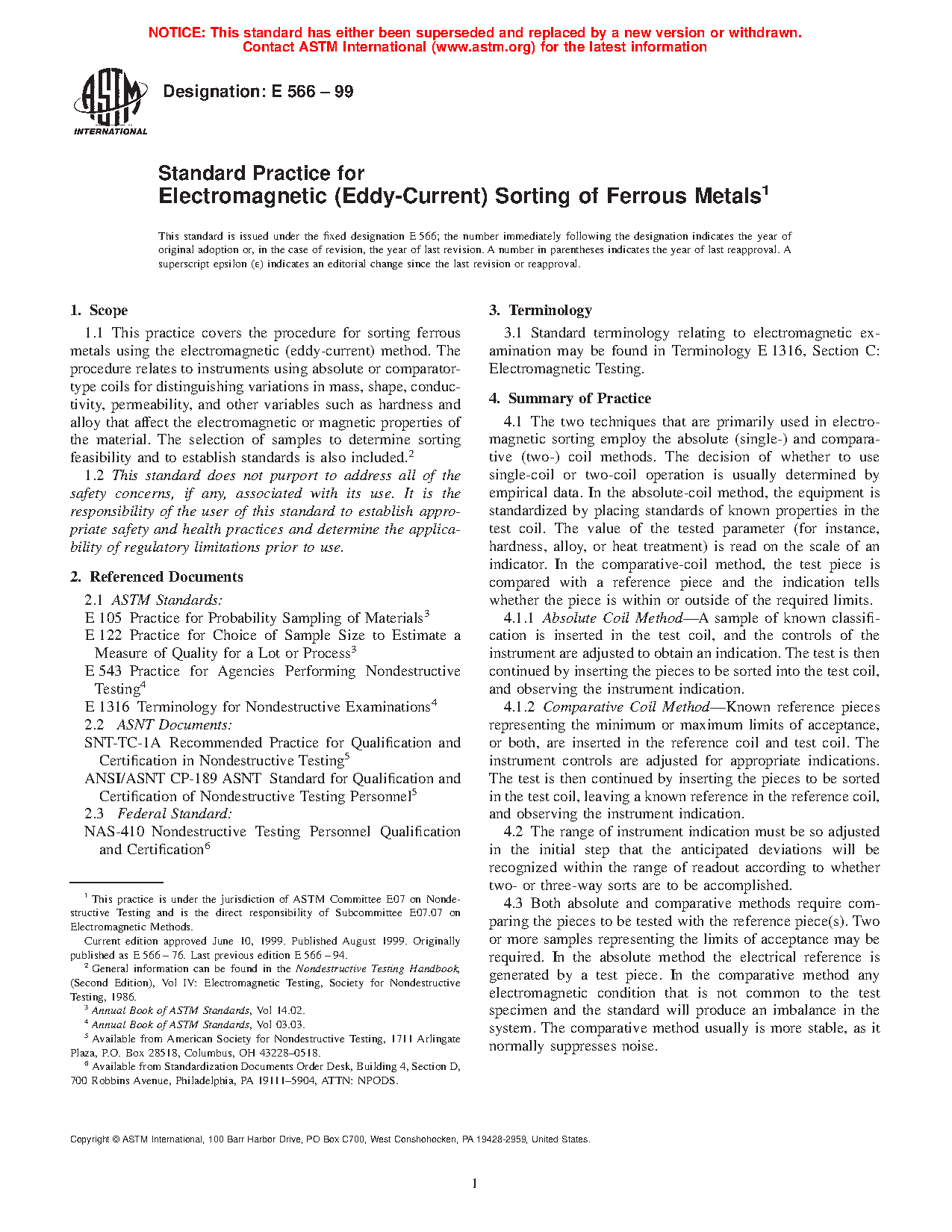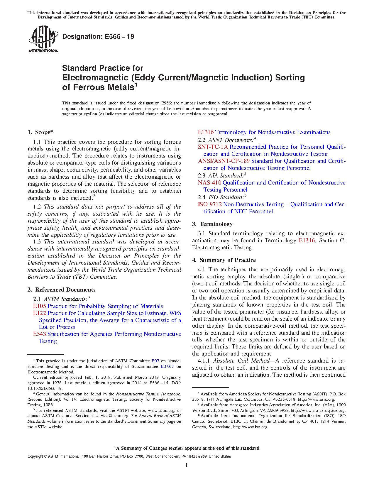 1.1 This practice covers the procedure for sorting ferrous metals using the electromagnetic (eddy-current) method. The procedure relates to instruments using absolute or comparator-type coils for distinguishing variations in mass, shape, conductivity, permeability, and other variables such as hardness and alloy that affect the electromagnetic or magnetic properties of the material. The selection of specimens to determine sorting feasibility and to establish standards is also included.