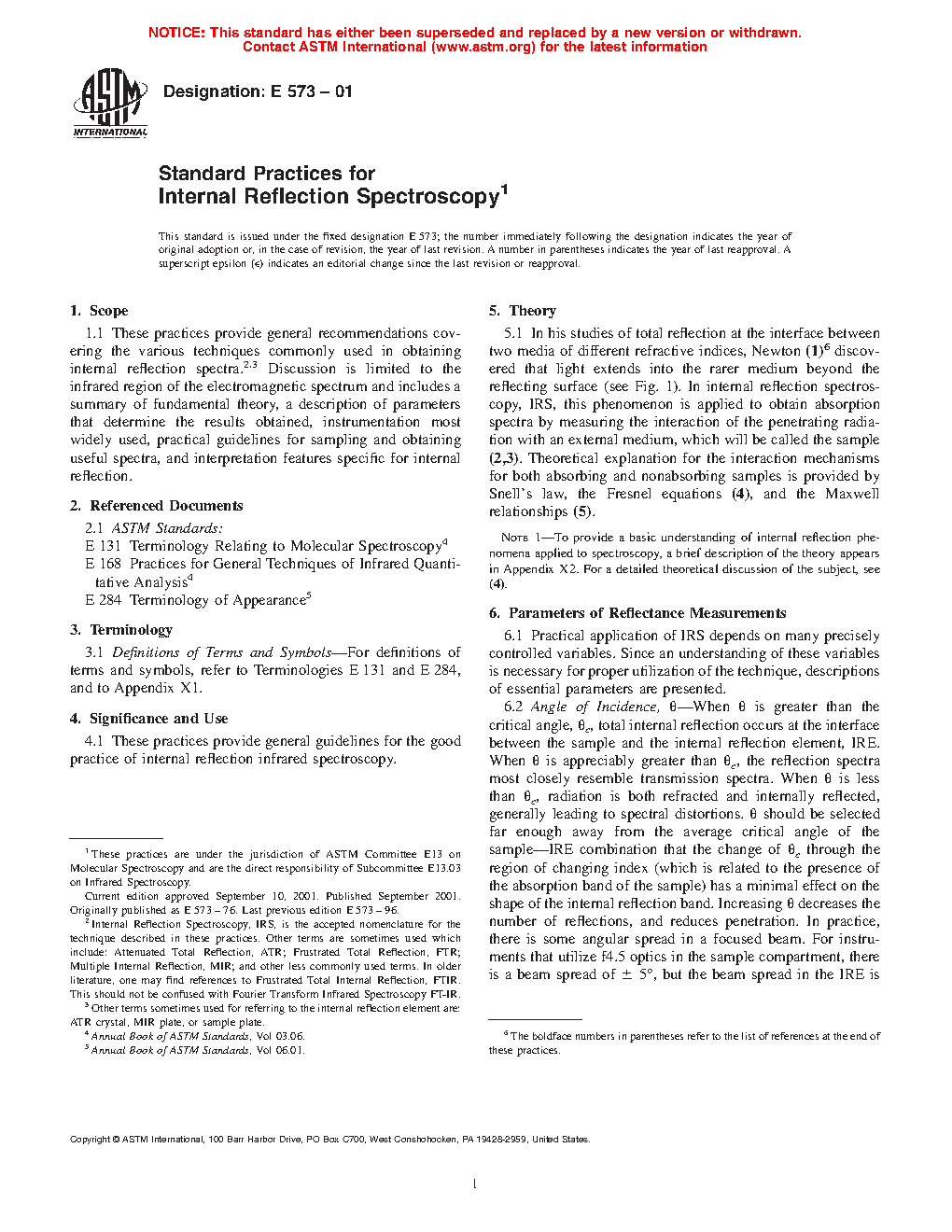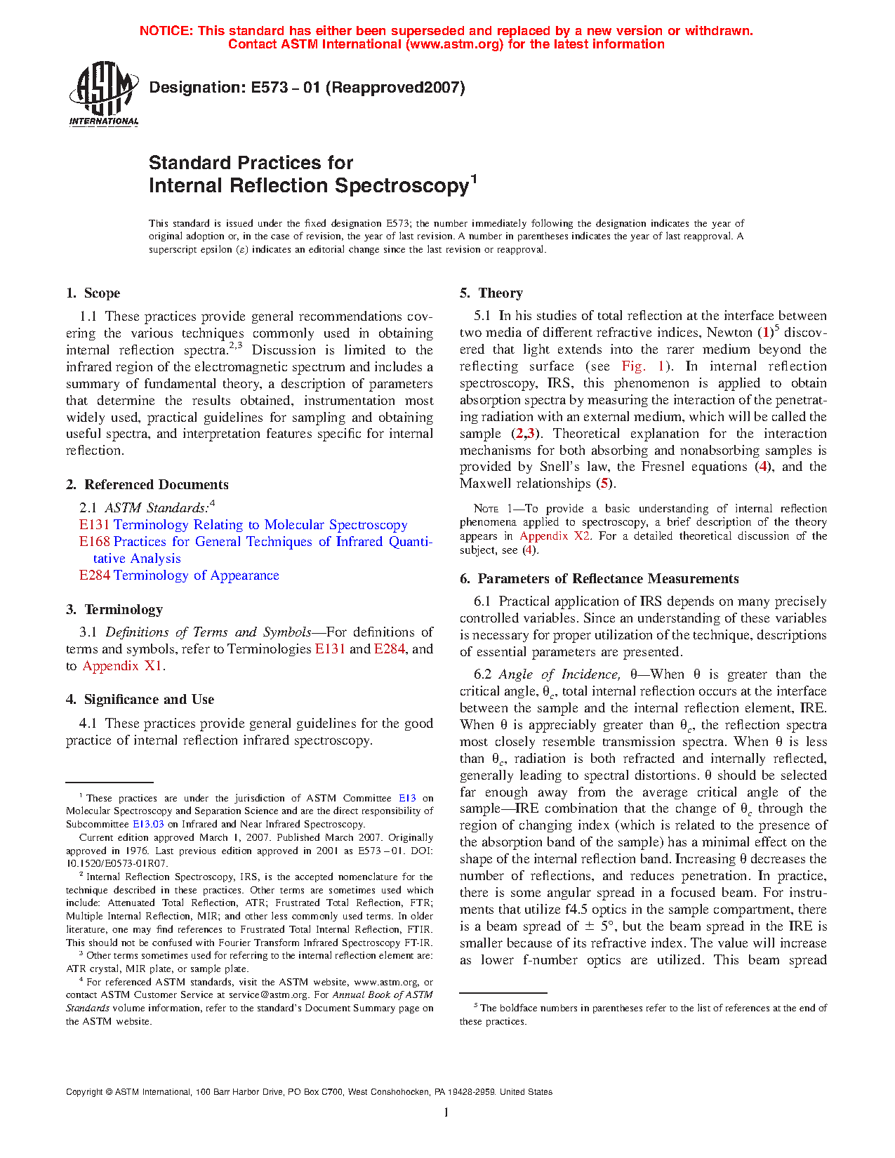 1.1 These practices provide general recommendations covering the various techniques commonly used in obtaining internal reflection spectra.2,3 Discussion is limited to the infrared region of the electromagnetic spectrum and includes a summary of fundamental theory, a description of parameters that determine the results obtained, instrumentation most widely used, practical guidelines for sampling and obtaining useful spectra, and interpretation features specific for internal reflection.
