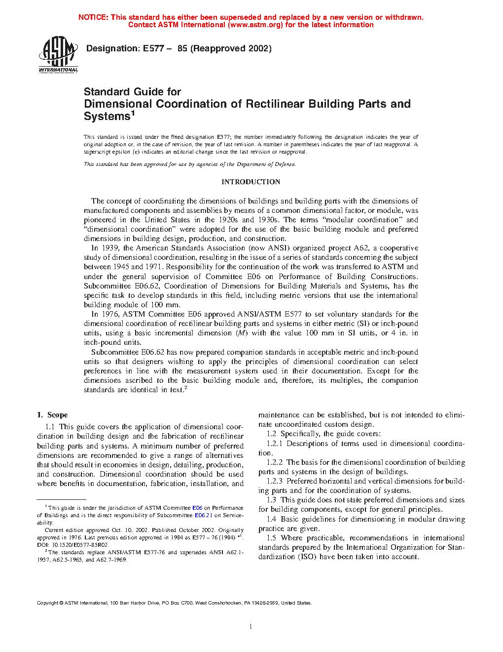 This guide covers the application of dimensional coordination in building design and the fabrication of rectilinear building parts and systems. A minimum number of preferred dimensions are recommended to give a range of alternatives that should result in economies in design, detailing, production, and construction. Dimensional coordination should be used where benefits in documentation, fabrication, installation, and maintenance can be established, but is not intended to eliminate uncoordinated custom design. Dimensional coordination of buildings and rectilinear building parts is based on the application of three related concepts such as modular reference grids of lines or planes to define reference locations in space, controlling dimensions in the horizontal and vertical plane as means of controlling the location of major building elements and rectilinear building parts, and coordinating dimensions for building components to reduce variety of sizes and to promote a better fit within the controlling reference system therefore minimizing wasteful cutting or fitting on site. The reference system for dimensionally coordinated design may consist of: a standard modular grid of dimensions; a multimodular grid of two or three dimensions, which may use different modules in different directions; or, a selected set of reference planes or lines spaced at modular intervals but without the use of a regular grid. The reference system is used in design and detailing decisions to locate building parts that may or may not be shown on working drawings.