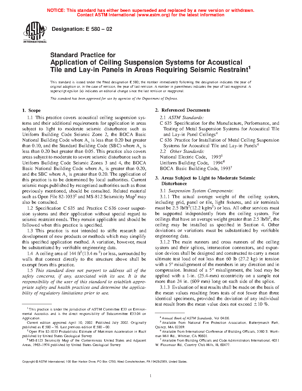 1.1 This practice covers acoustical ceiling suspension systems and their additional requirements for application in areas subject to seismic disturbance such as Uniform Building Code Seismic Zone 2, the BOCA Basic National Building Code where Av is less than 0.20 but greater than 0.10 and the Standard Building Code (SBC) where Av is less than 0.20 but greater than 0.05. This practice also covers areas subject to moderate to severe seismic disturbance such as Uniform Building Code Seismic Zones 3 and 4, the BOCA Basic Natiuonal Building Code where Av is greater than 0.20, and the SBC where Av is greater than 0.20. The application of this practice is to be determined by local authorities. Current seismic maps published by recognized authorities such as those previously mentioned, should be consulted. Related Material such as Open File 82-1033 and MS-812 Seismicity Map may also be consulted.